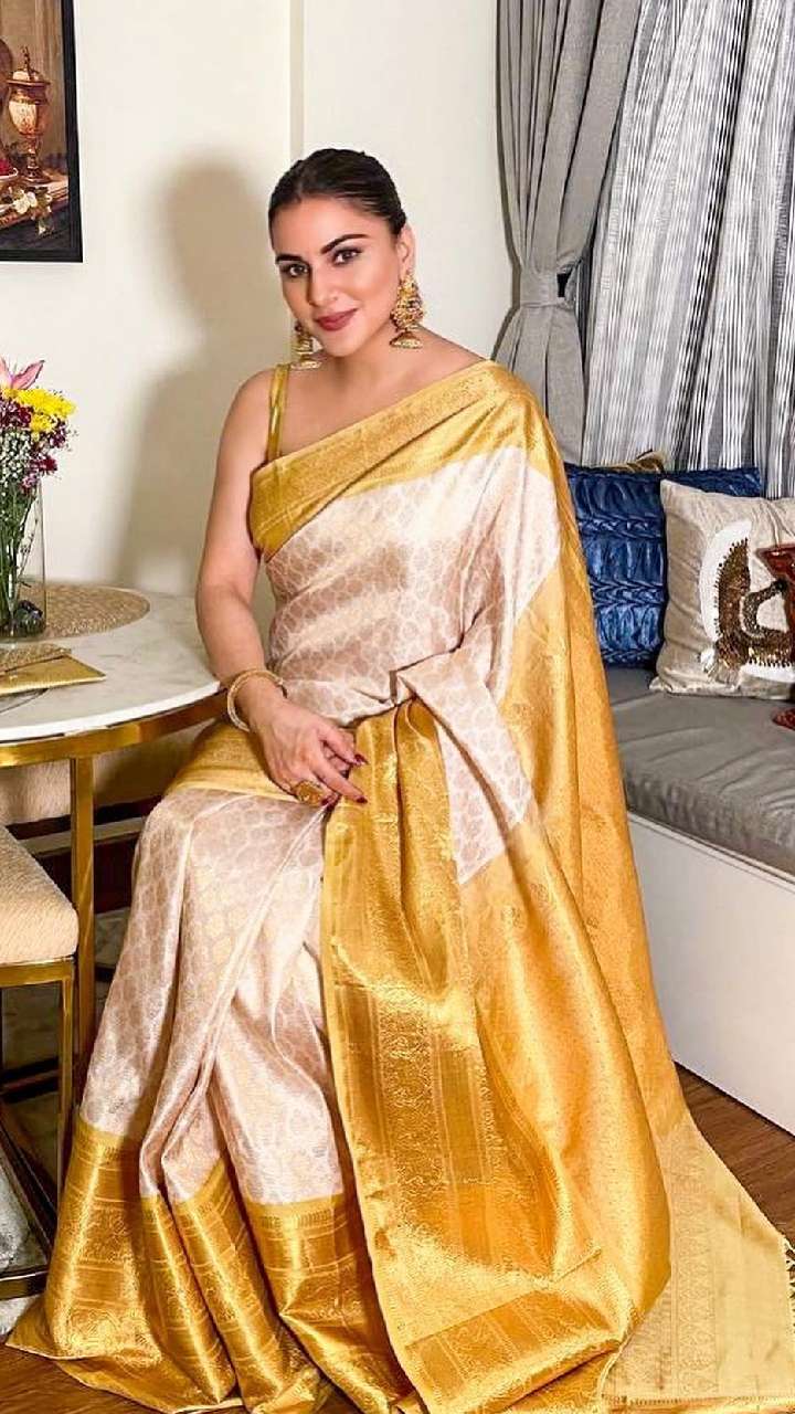 गोल्डन और सिल्वर कलर की सिल्क साड़ी में श्रद्धा आर्य बहुत सुंदर लग रही हैं। एक्ट्रेस के ये लुक आप भी कैरी करें।