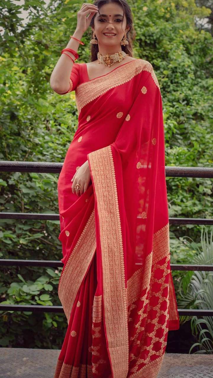 2024 में करवा चौथ 20 अक्टूबर को मनाया जाएगा। अगर आप भी चाहती हैं कि इस खास दिन पर आपके पति आपके दीवाने हो जाएं तो आप इस तरह की लाल साड़ी पहनें।