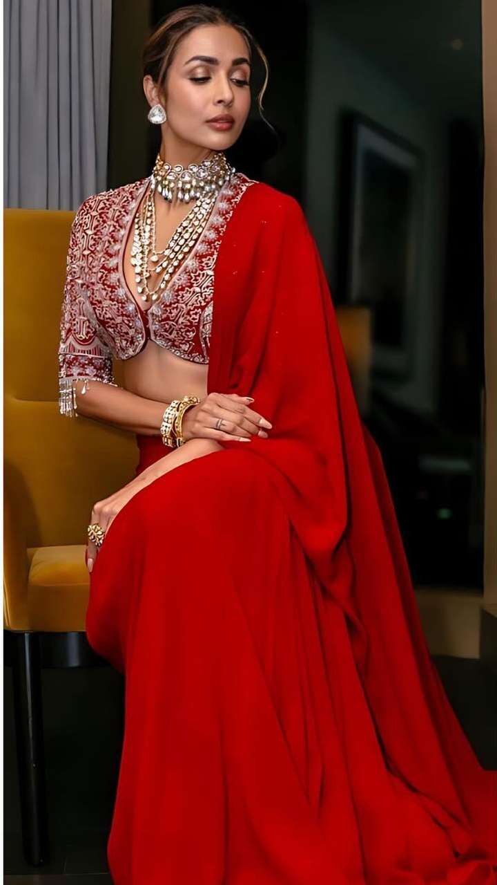 मलाइका अरोड़ा इस प्लेन साड़ी में बहुत सुंदर लग रही हैं। प्लेन साड़ी के साथ एक्ट्रेस ने हैवी वर्क ब्लाउज पेयर किया है।