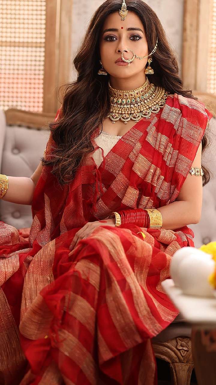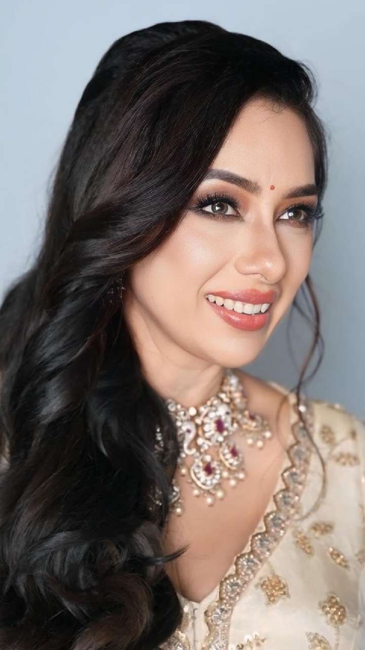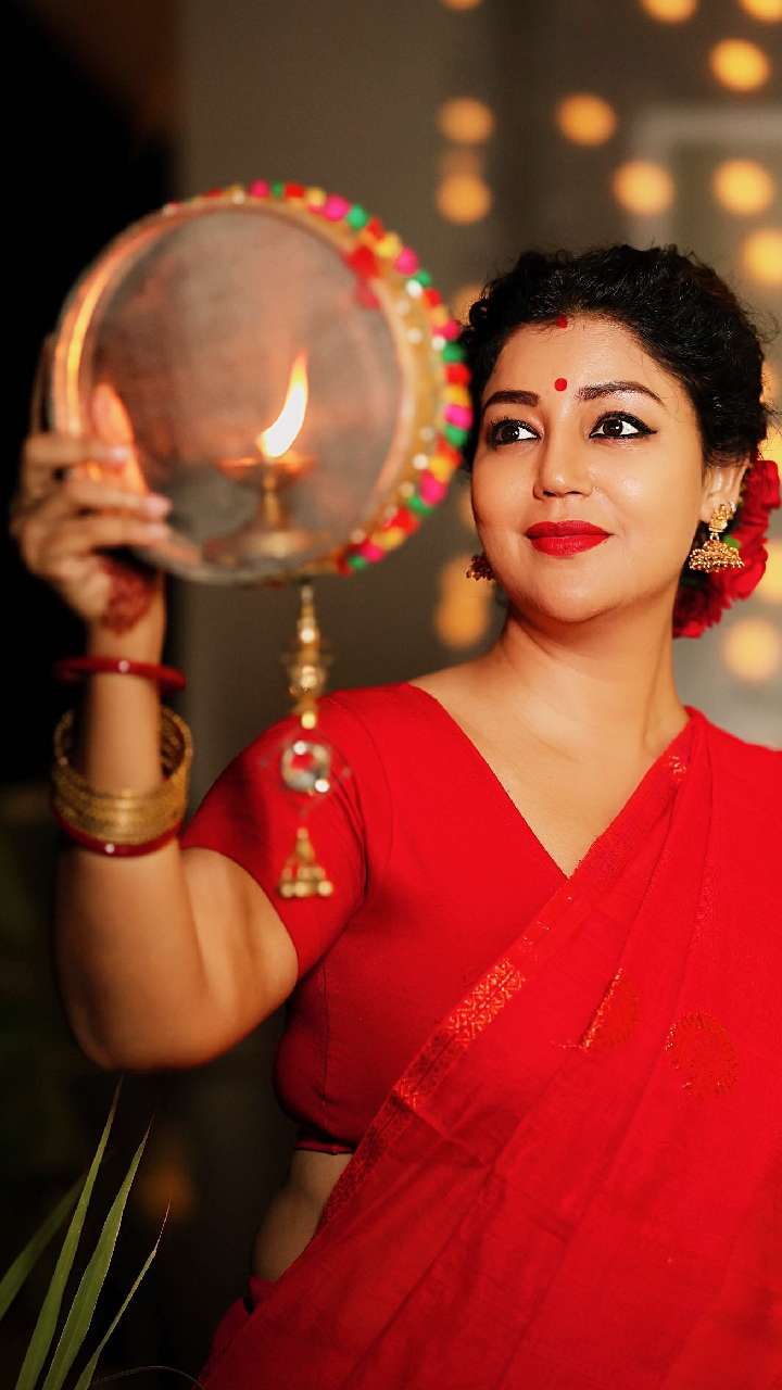 आप इस तरह का एचडी मेकअप टच इस करवाचौथ पर ट्राई कर सकती हैं। इसमें चीक्स पर रेड ब्लश लुक और आंखों के नीचे शिमरी काजल लुक दिया गया है।
