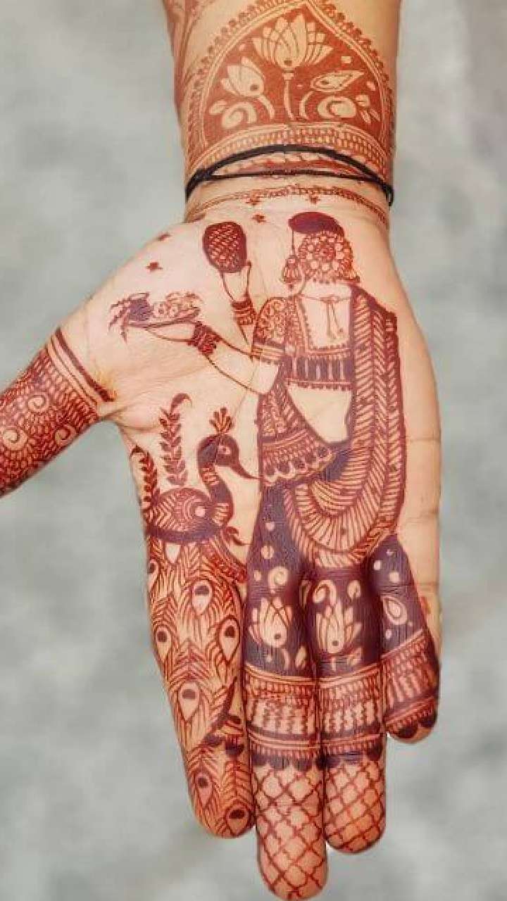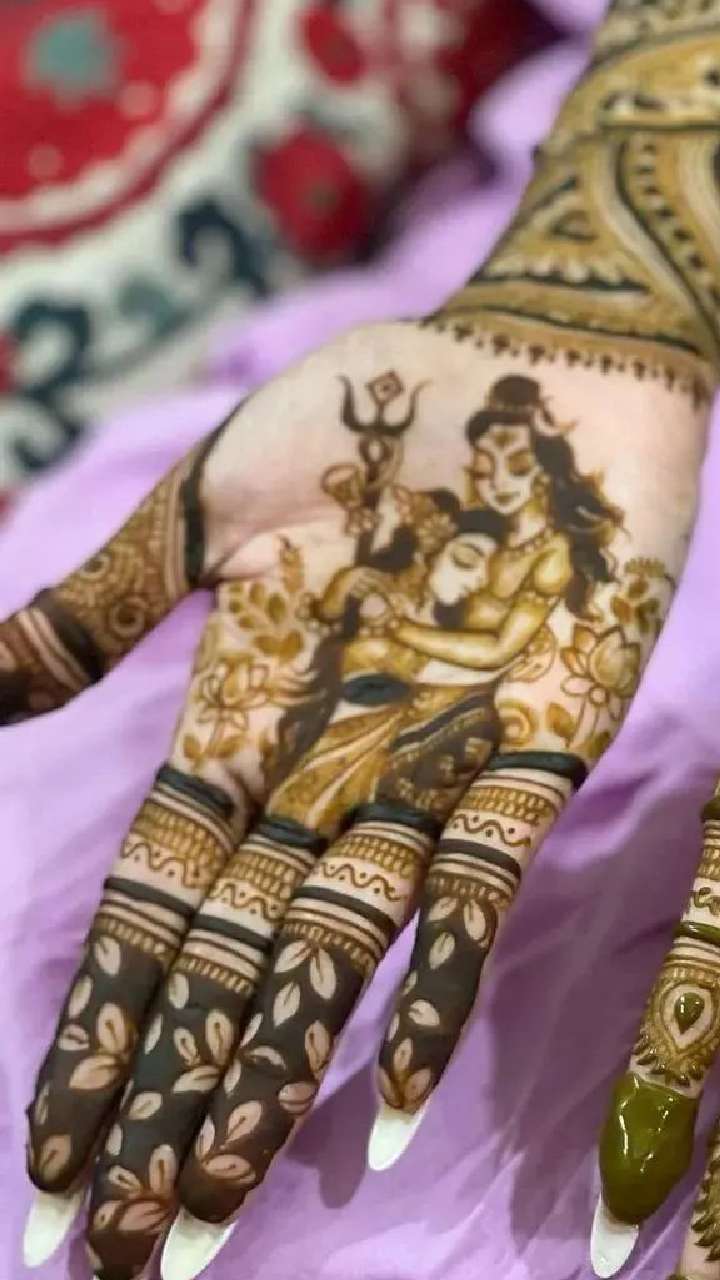 आप इस करवा चौथ अपने हाथों पर शिव-पार्वती जी की आकृति वाला मेहंदी डिजाइन बनवा सकती हैं। ये काफी यूनिक डिजाइन रहेगा।