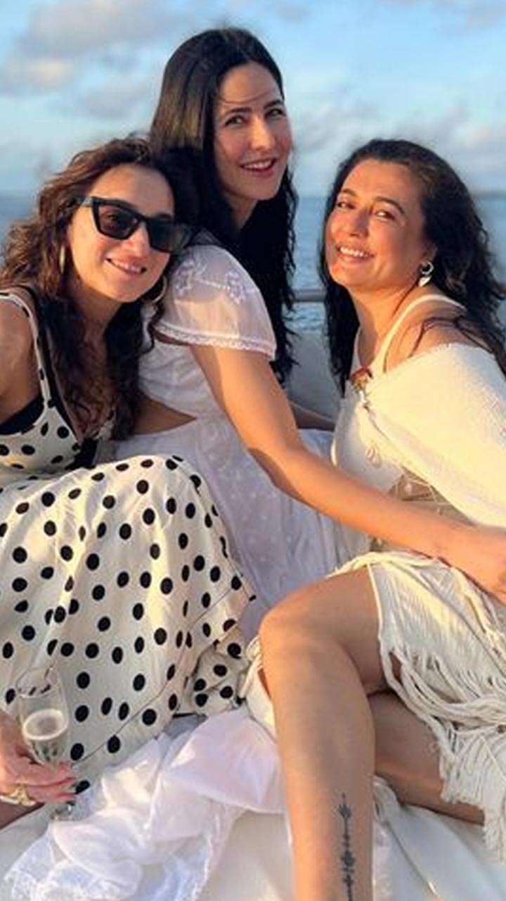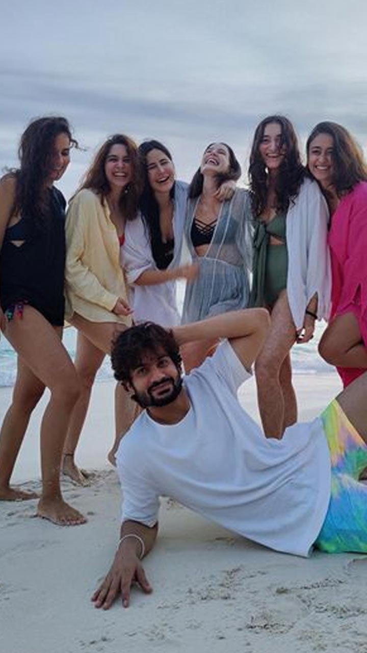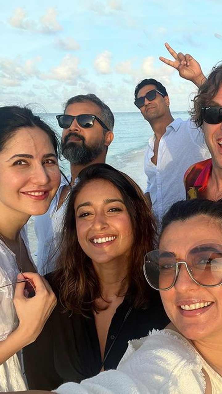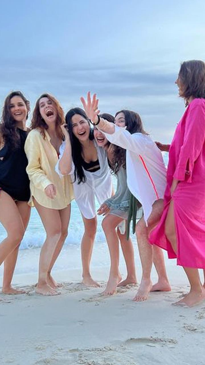 एक फोटो में कटरीना कैफ को अपने दोस्तों के साथ समुद्र किनारे फोटो क्लिक कराते हुए देखा जा सकता है।