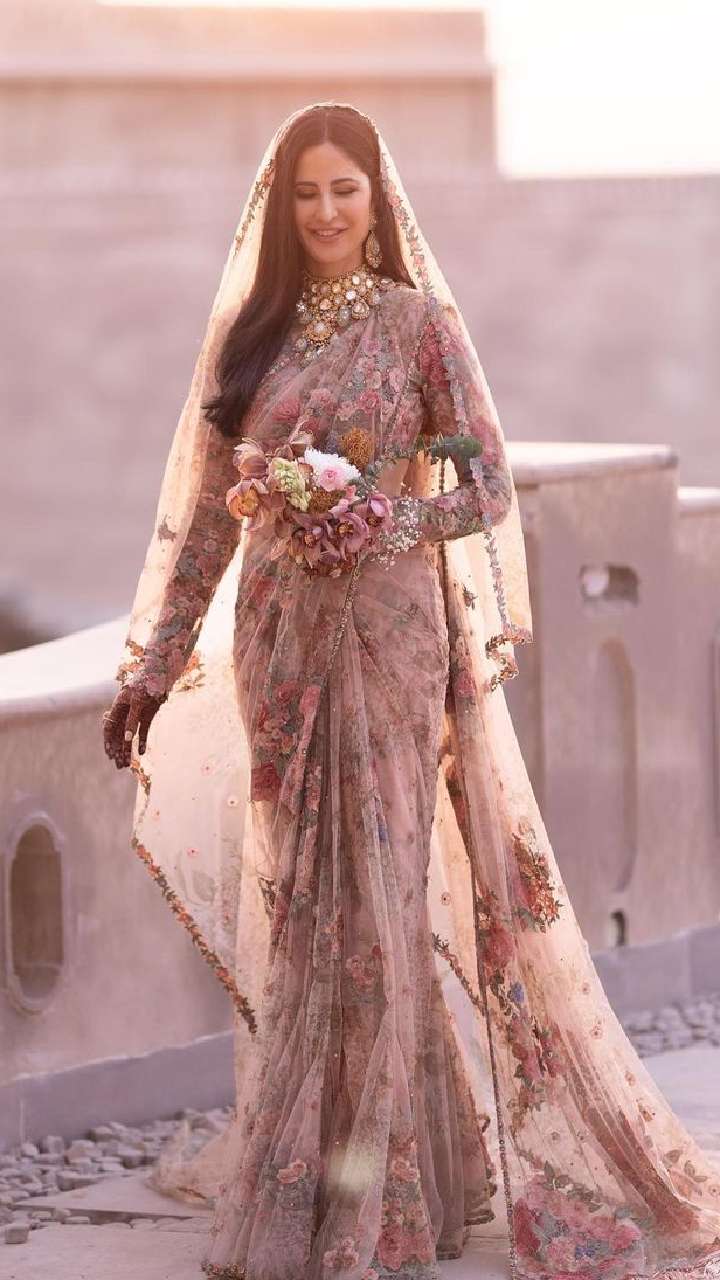 कटरीना कैफ ने अपनी शादी में बेहद खूबसूरत साड़ी पहनी थी। लाइट शेड की साड़ी के साथ एक्ट्रेस ने मिनिमल मेकअप किया था।