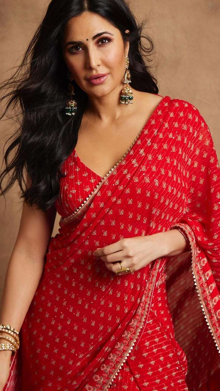 कटरीना इस रेड साड़ी में बला की खूबसूरत लग रही हैं। एक्ट्रेस का ये देसी लुक शानदार है।