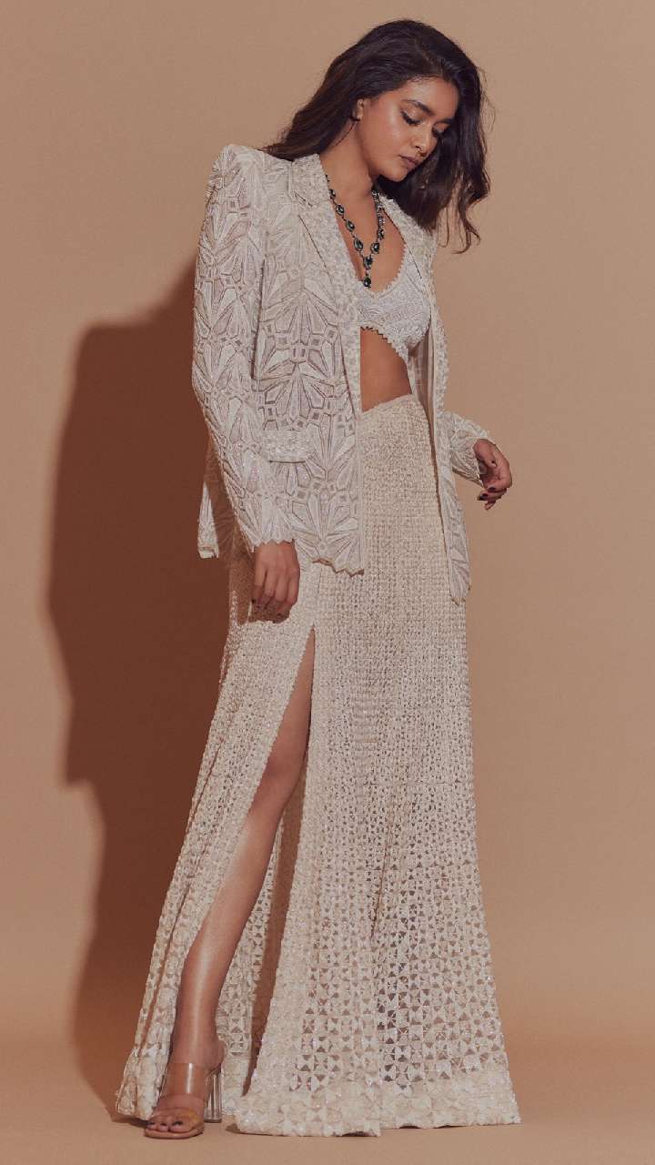 अपने लुक को वेस्टर्न लुक का तड़का देने के लिए आप कीर्ति सुरेश की तरह ही इंडो-वेस्टर्न ड्रेस को स्टाइल कर सकती हैं।
