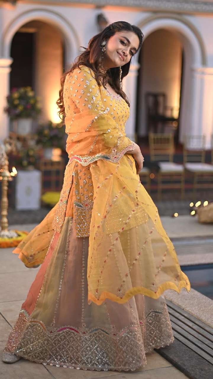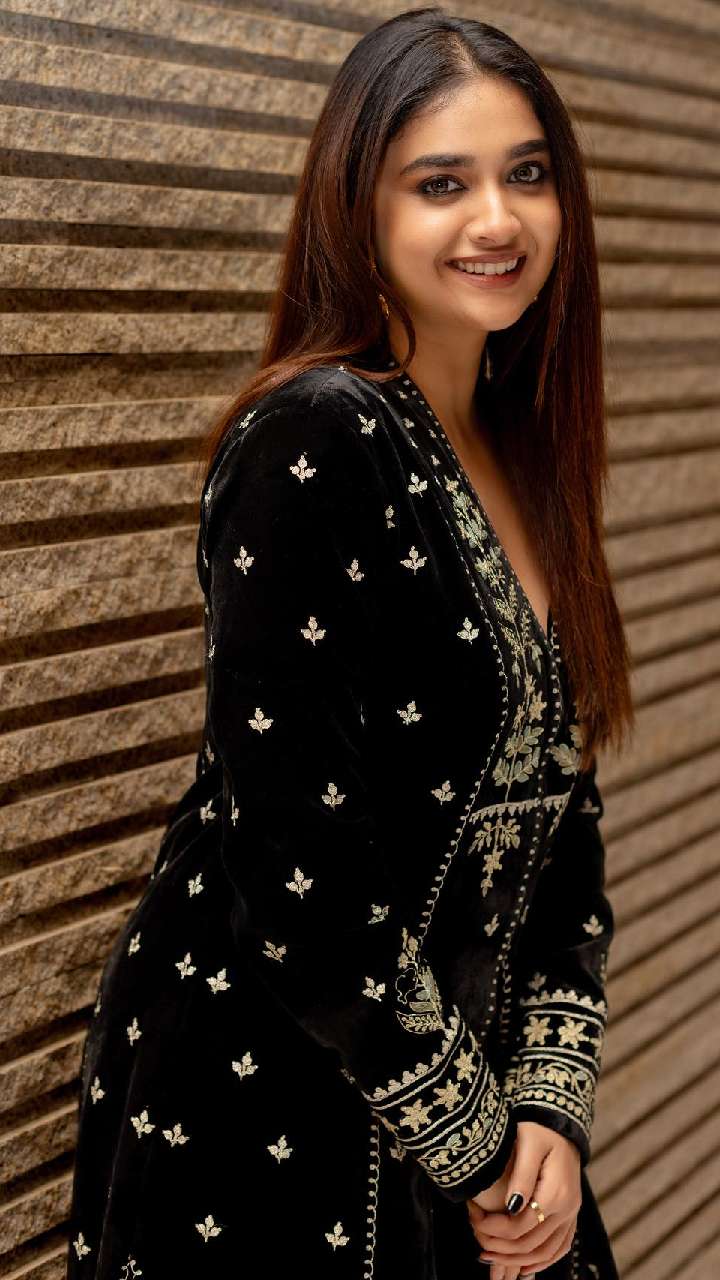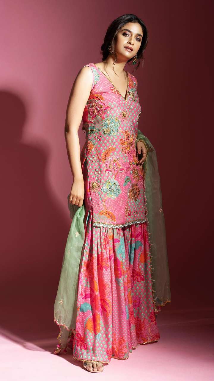 पिंक कलर के शरारा पैटर्न सूट में कीर्ति सुरेश का लुक काफी ज्यादा शानदार लग रहा है। आप भी एक्ट्रेस के इस लुक को स्टाइल कर सकती हैं।