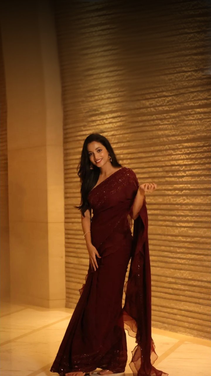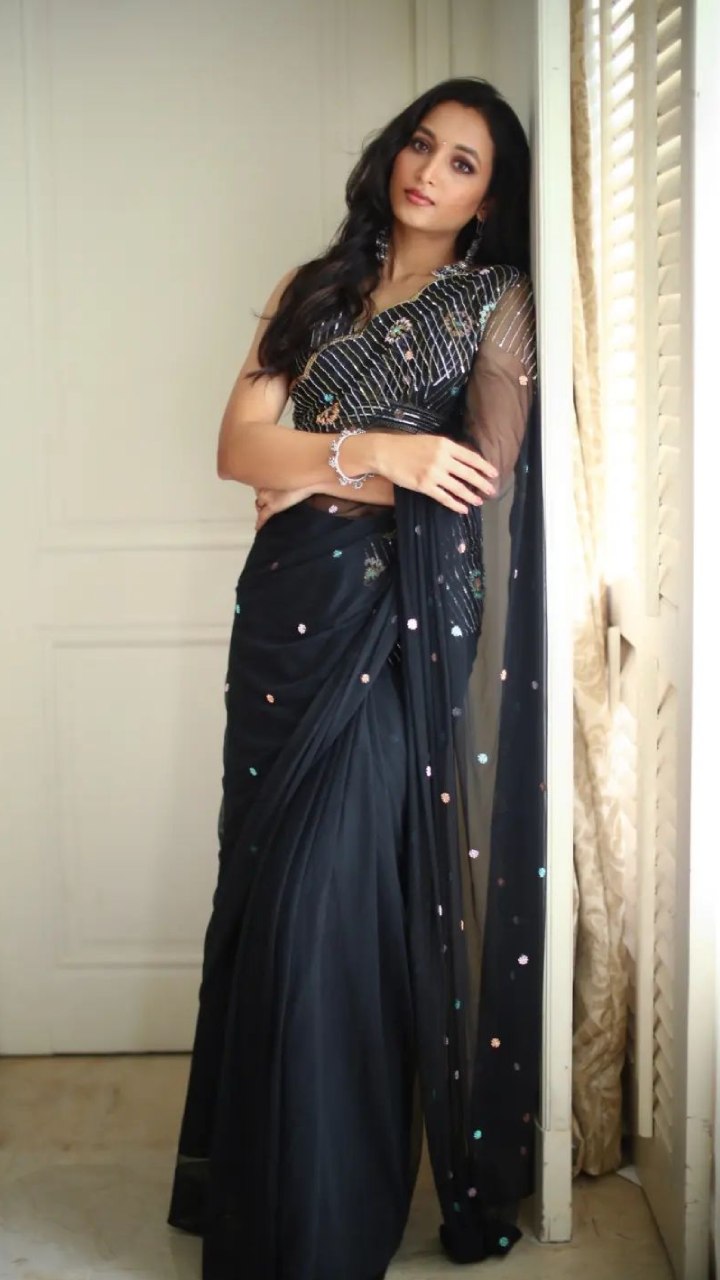 एक्ट्रेस इस ब्लैक कलर की डिजाइनिंग साड़ी में काफी हसीन लग रही हैं।