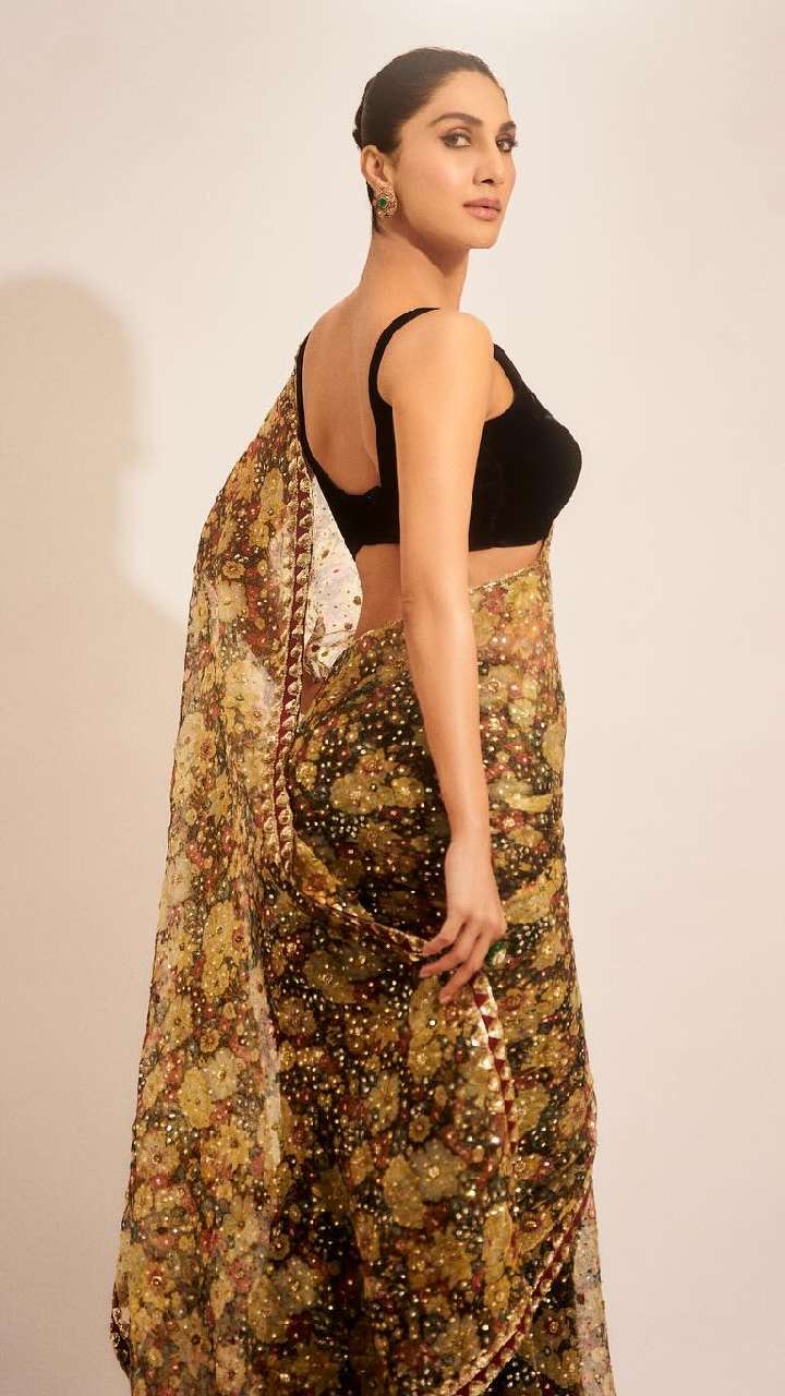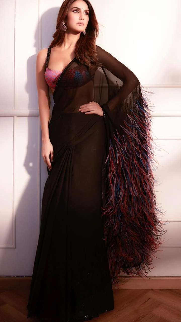 अभिनेत्री ब्लैक कलर की प्लेन साड़ी स्लीवलेस ब्लाउज में अपने बोल्ड लुक से दीवाना बना रही हैं। उनकी साड़ी में रफल डिजाइन पल्लू शानदार लुक दे रहा है।