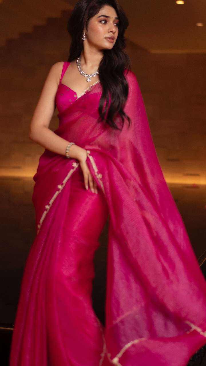 पिंक कलर की इस प्लेन टिश्यू साड़ी में कृति शेट्टी का लुक शानदार लग रहा है। पिंक साड़ी के साथ एक्ट्रेस ने मैचिंग का स्लीवलेस ब्लाउज पहना है।
