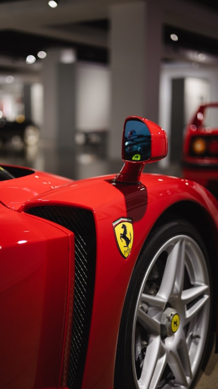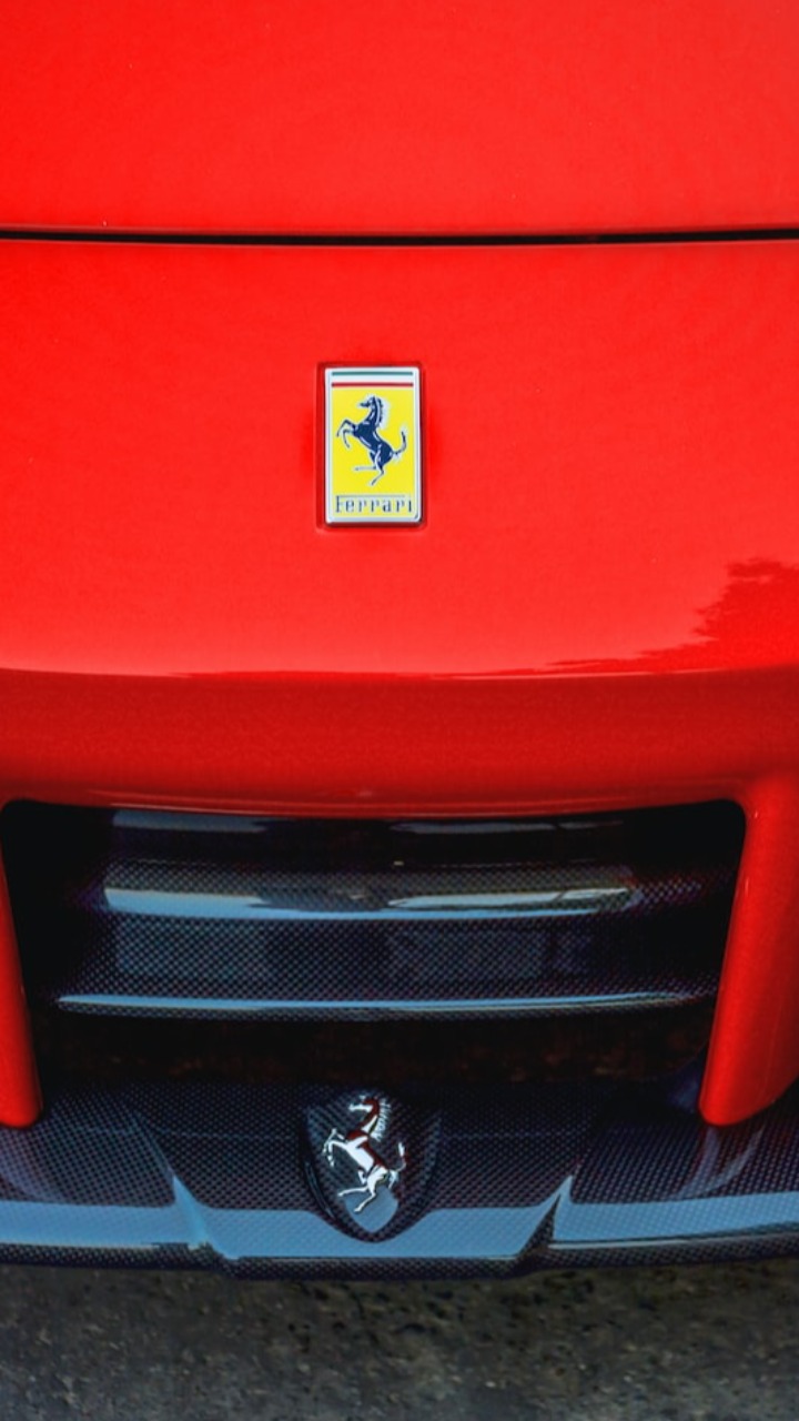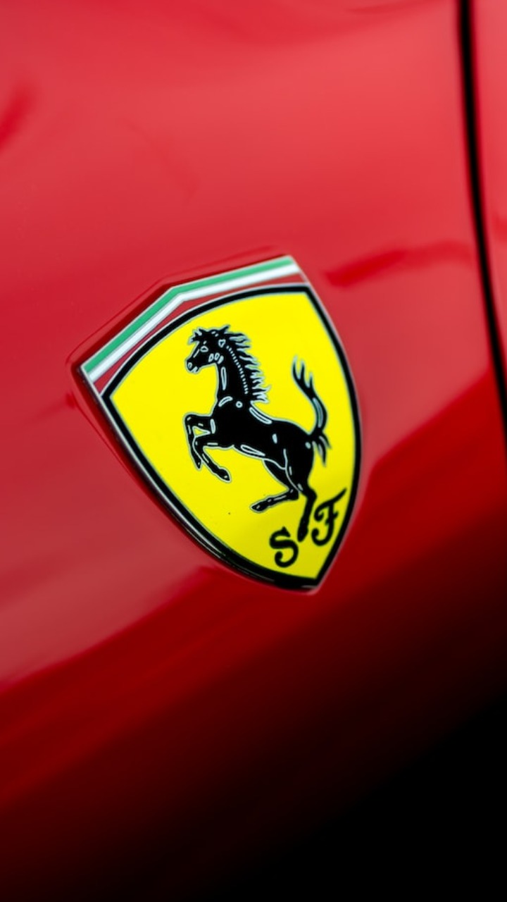 उछलता हुआ घोड़ा, पीले रंग की शील्ड और ऊपर की तरफ हरी और लाल पट्टी, फेरारी के इस लोगो की पहचान है।