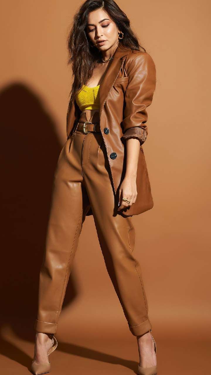विंटर के सीजन में आप कृति खरबंदा के इस लेदर आउटफिट को भी कैरी कर सकती हैं। इस लुक में एक्ट्रेस बहुत क्लासी लग रहीं हैं।