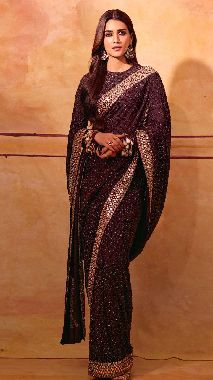 कृति का ब्लैक मिरर बॉर्डर साड़ी लुक शानदार लग रहा है। ऐसी साड़ियां वेडिंग से लेकर फेस्टिवल हर जगह खिलती हैं।