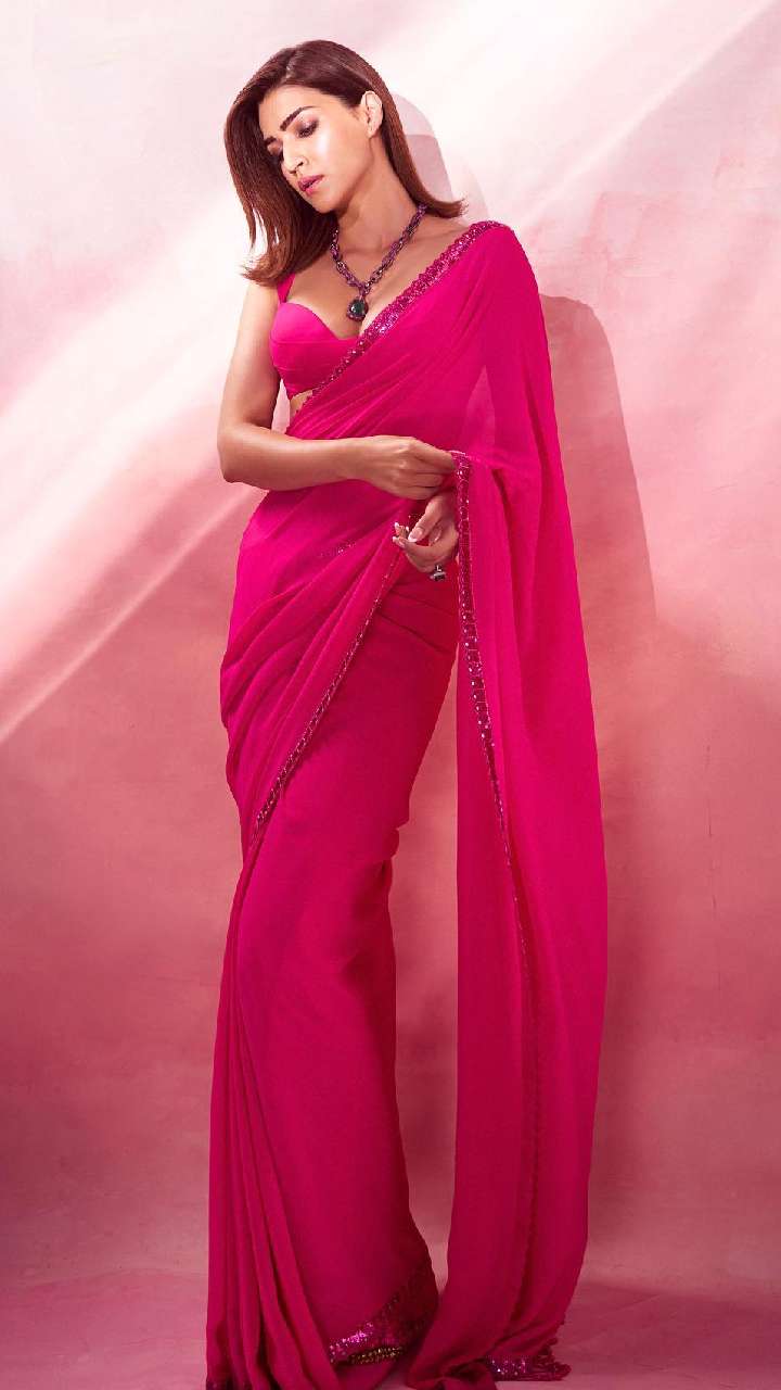 पिंक कलर की प्लेन स्लिम बॉर्डर साड़ी डीपनैक ब्लाउज में कृति कहर ढहा रही हैं। कर्वी गर्ल्स के फिगर पर ऐसी साड़ियां काफी जंचती हैं।