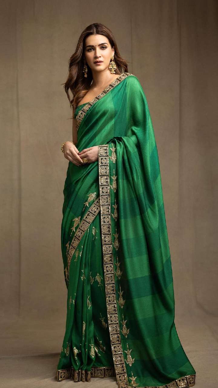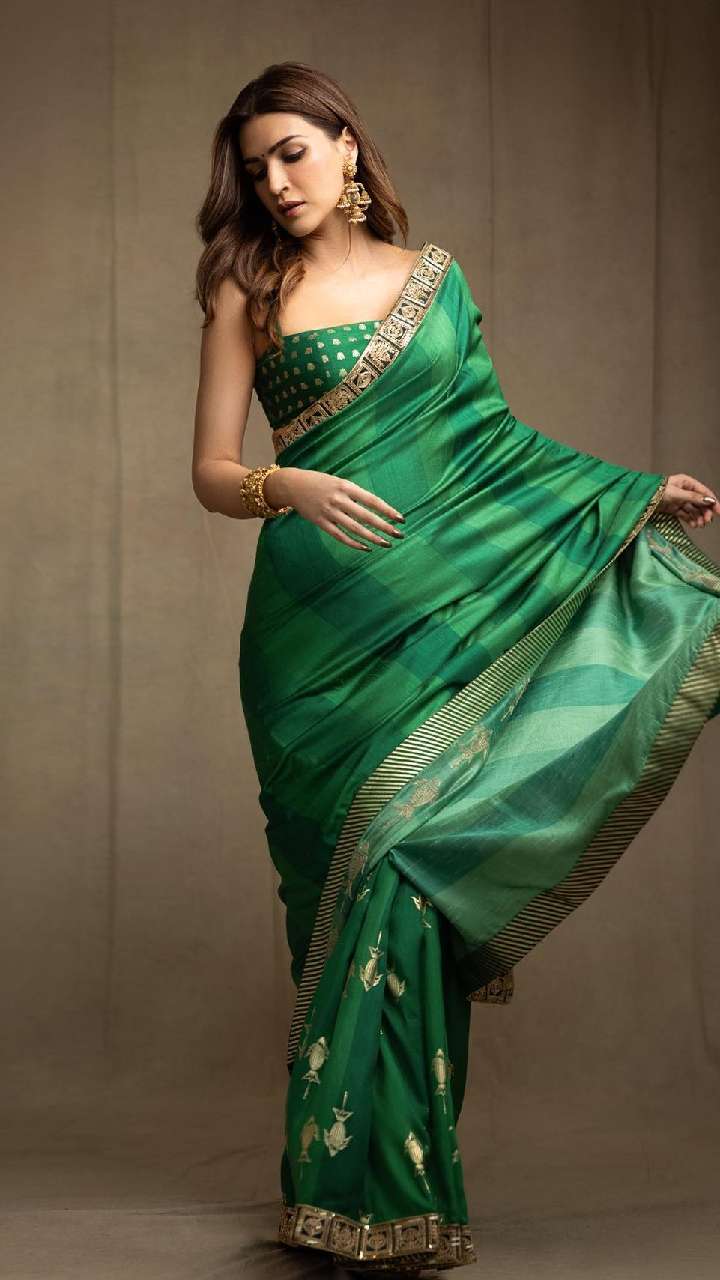 हाल में एक्ट्रेस ग्रीन कलर की सेल्फ प्रिंट जरी बॉर्डर साड़ी में अपना प्रिटी लुक शेयर किया है। इसके साथ उन्होंने कट स्लीव्स ब्रॉड नेक ब्लाउज पेयर किया है।