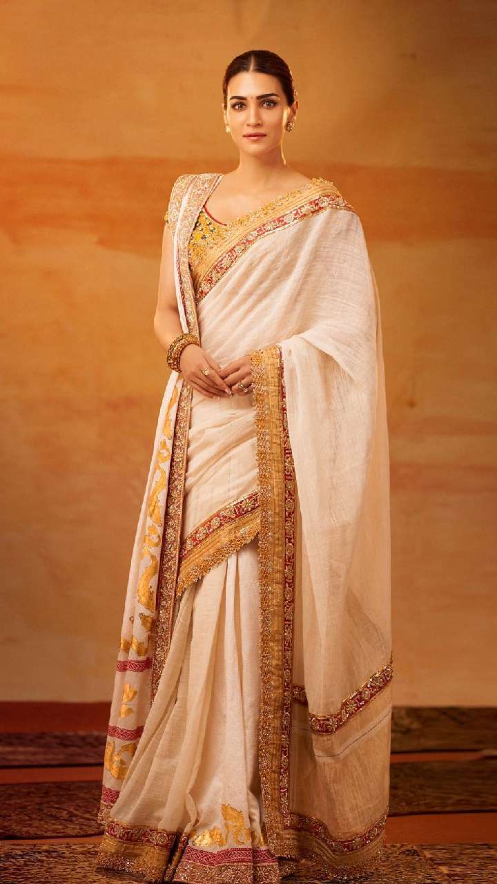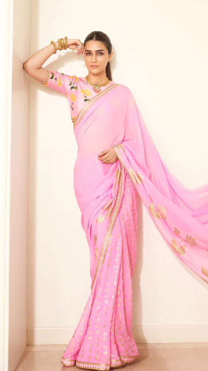 पिंक कलर की गोल्डन एम्ब्रॉयडरी साड़ी जीरो नेक वन फोर्थ स्लीव्स ब्लाउज में कृति एकदम परम् सुंदरी लग रही हैं।