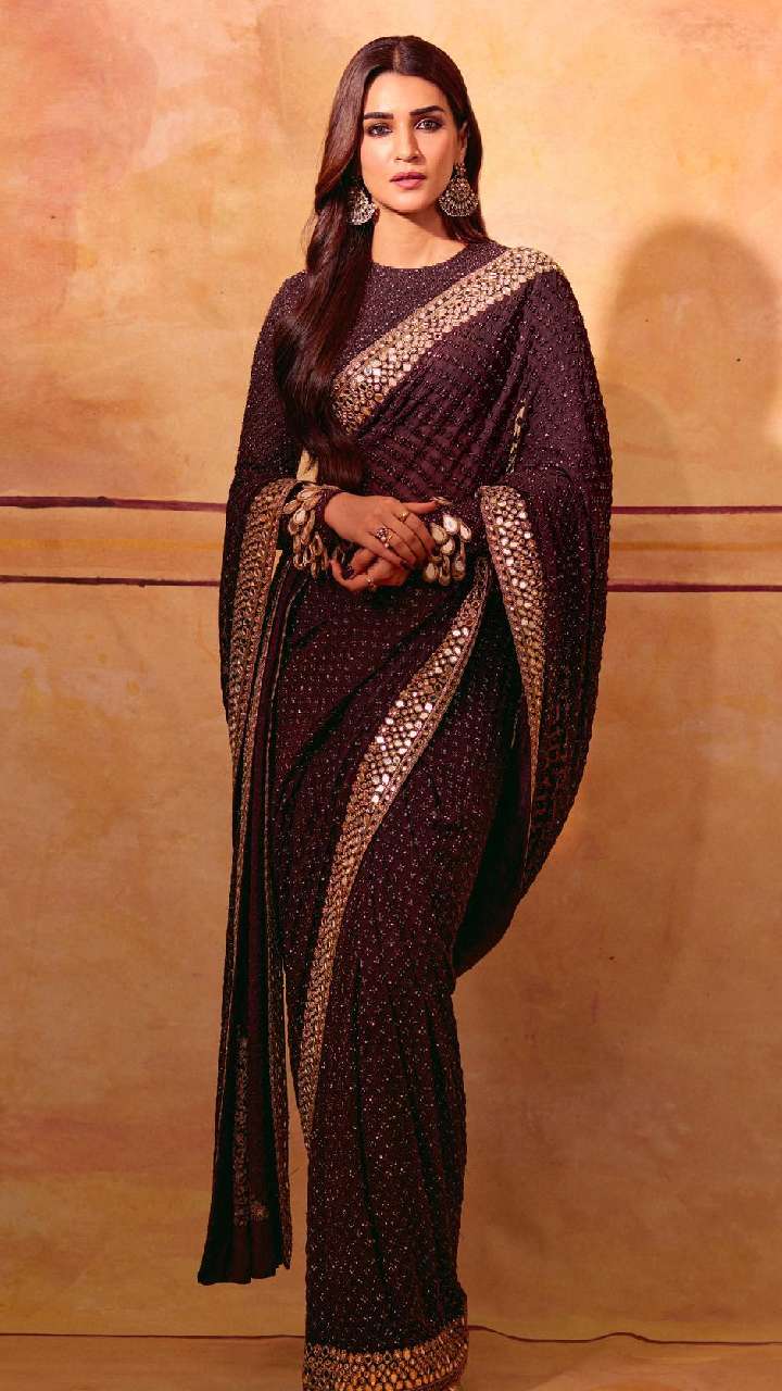 कृति सेनन का ब्लू सेक्विन नेटिड साड़ी में बोल्ड अंदाज फैंस के दिलों को घायल कर रहा है। इसके साथ हाल्टर नेक ब्लाउज खूबसूरती में चार चांद लगा रहा है।