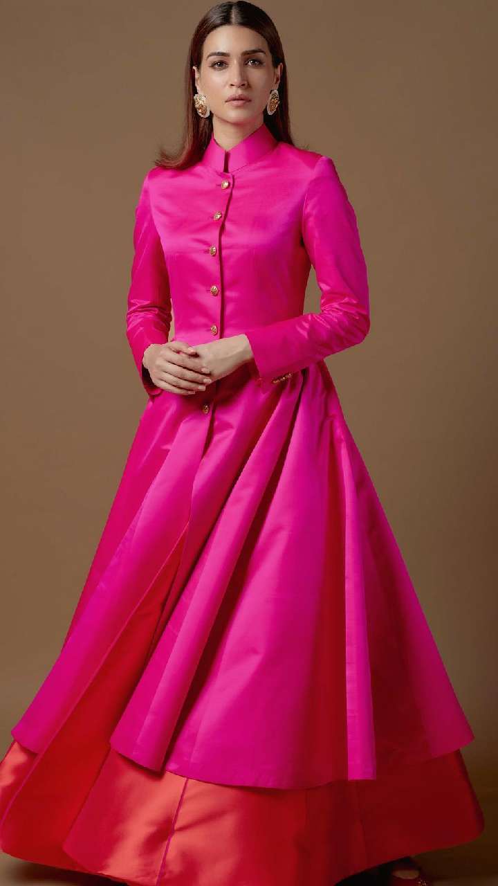 आप इस रक्षाबंधन कृति के पिंक और ऑरेंज कलर वाले हाई नेक कुर्ती विद स्कर्ट लुक को ट्राई कर सकती हैं। ये काफी स्मार्ट लुक देगा।