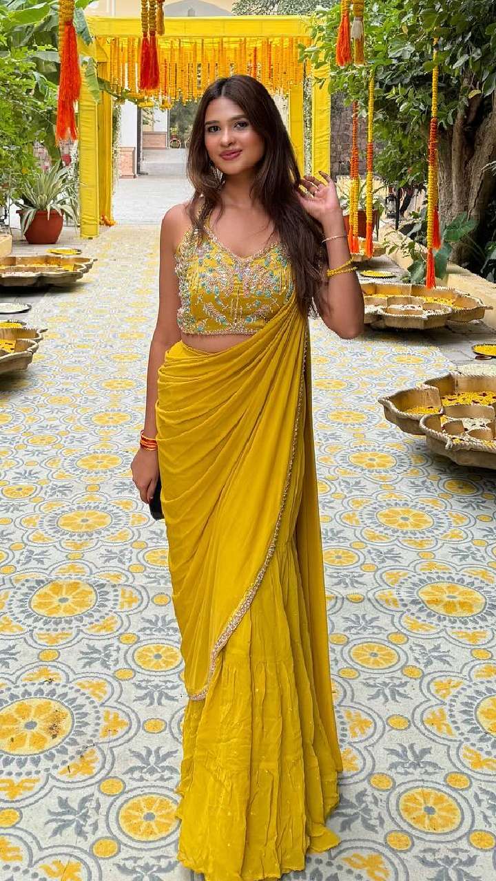 अग्रता ने येलो कलर की रेडी टू वियर साड़ी स्टाइल की है। इस तरह की साड़ी को आप हल्दी के फंक्शन के लिए ऑप्शन में रख सकती हैं।