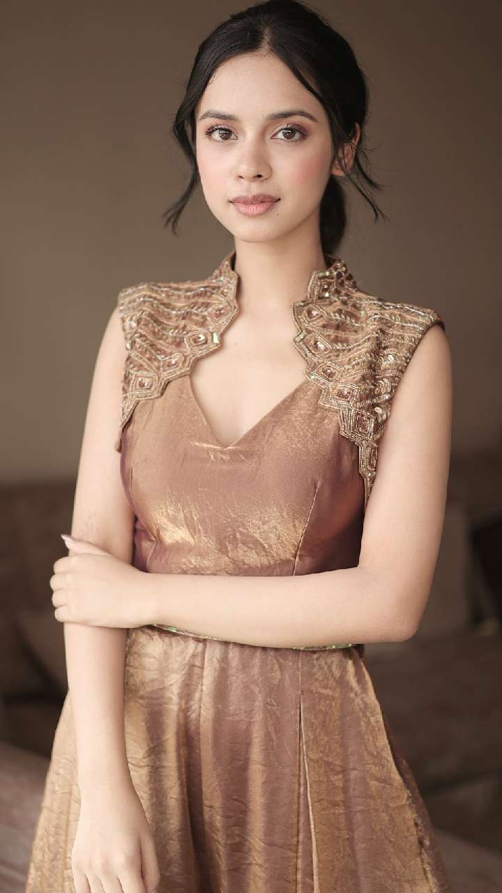 Nitanshi की ड्रेस का यह बैक डिजाइन देखने में बेहद अट्रैक्टिव और स्टाइलिश लग रहा है। यंग गर्ल्स कर्ली हेयर स्टाइल के साथ एक्ट्रेस की ड्रेस को बर्थडे पार्टी में पहन सकती हैं।