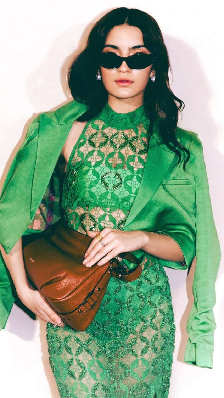 एक्ट्रेस ने ग्रीन बिकनी के ऊपर बॉडीकॉन नेट ड्रेस को पहना है। साथ ही, लॉन्ग ब्लेजर से अपने लुक को कंप्लीट किया है। Pratibha का स्टाइलिश हैंडबैग और चश्मा लुक में चार चांद लगा रहा है।