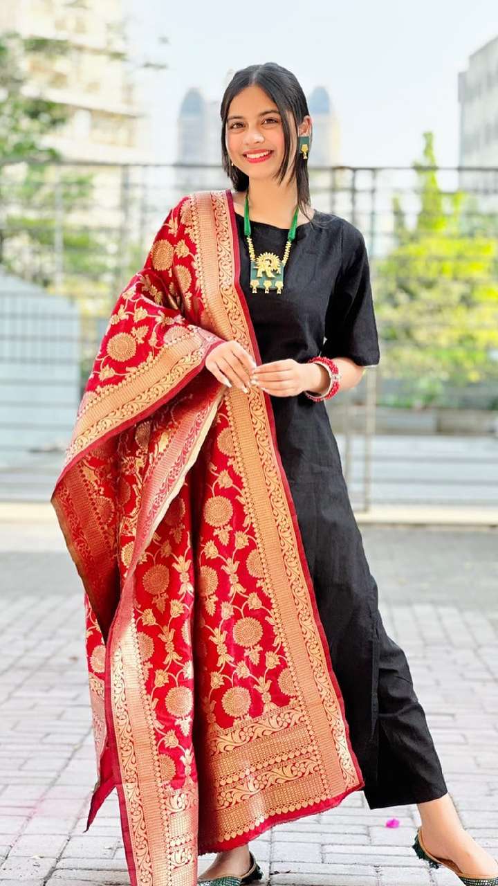 इस तरह के ब्लैक पेंट सूट के साथ सिल्क दुपट्टा लुक काफी ट्रेंड में रहते हैं। न्यूली मैरिड इस लुक को ट्राई कर सकती हैं।