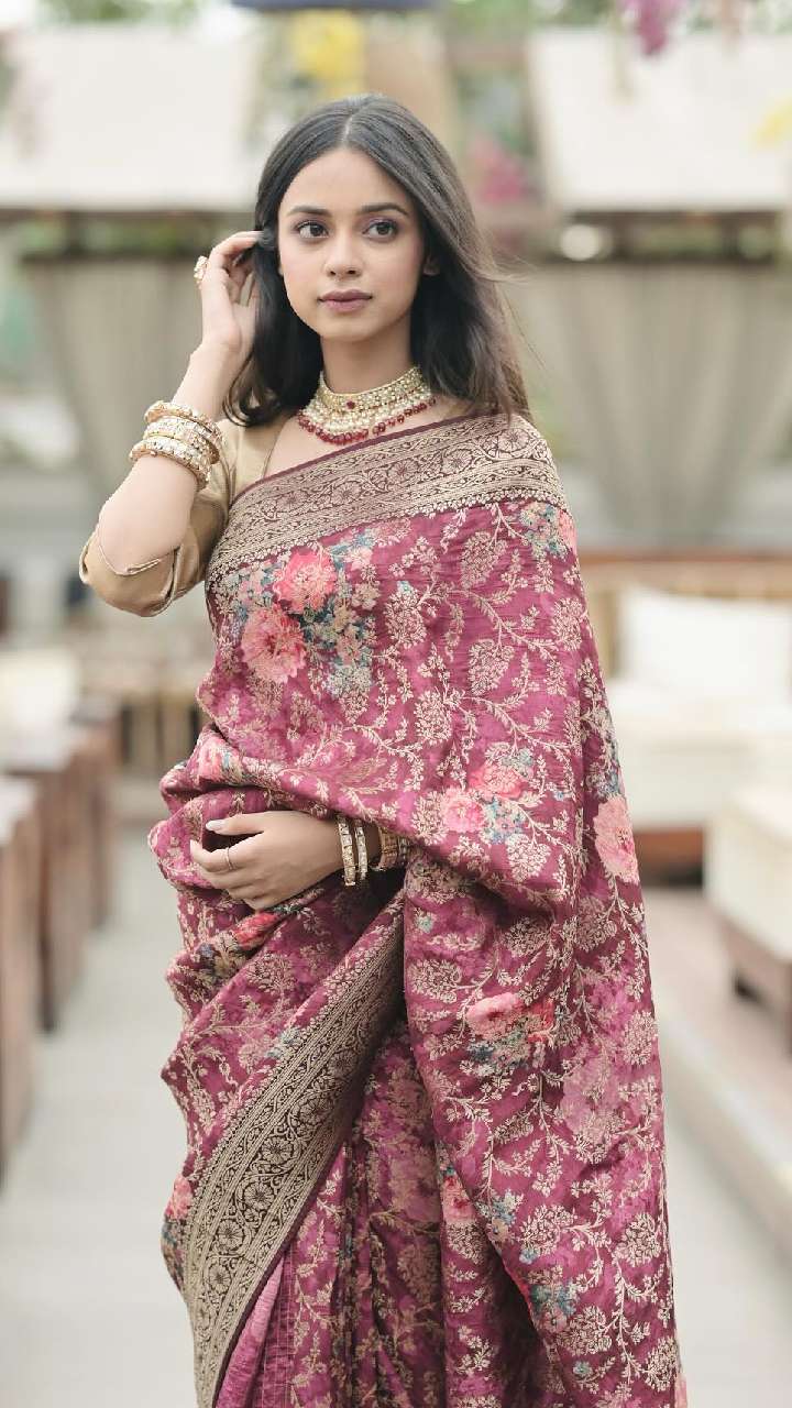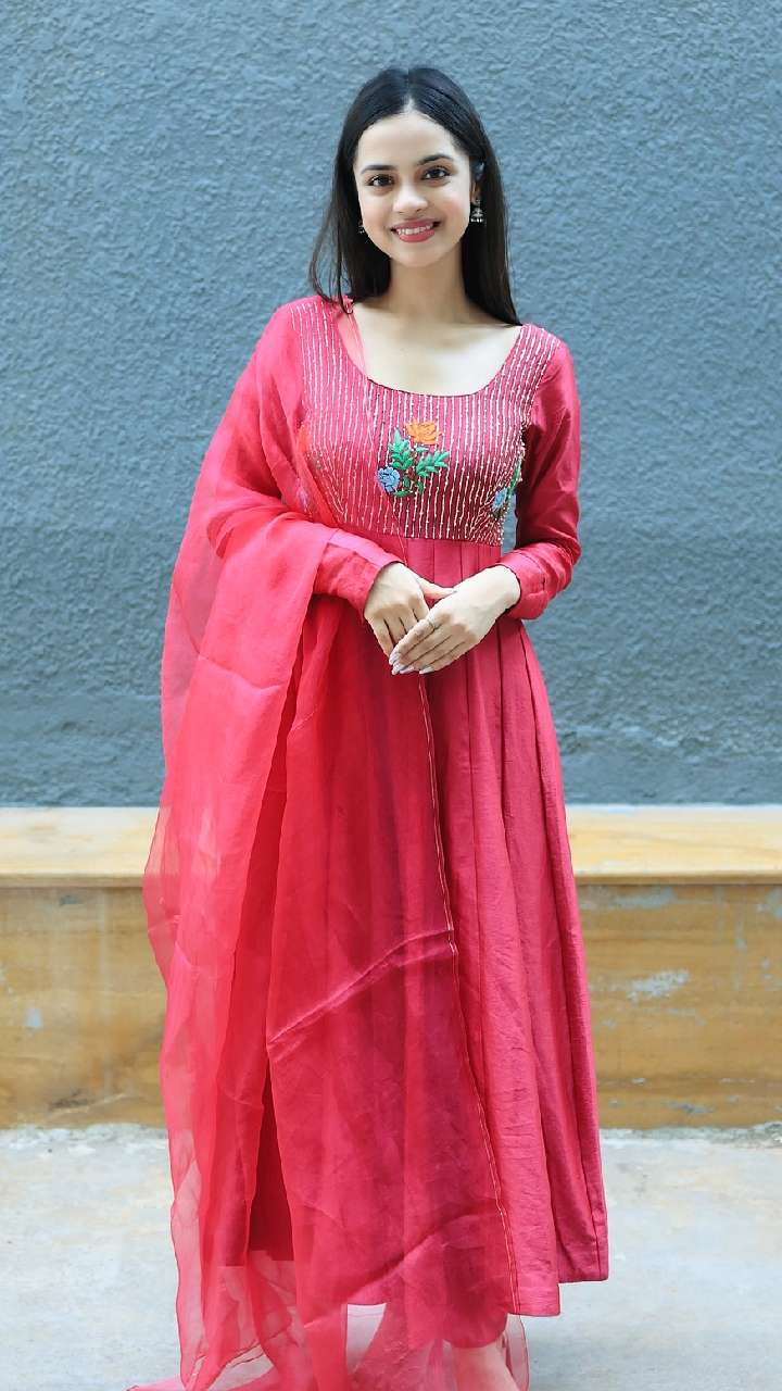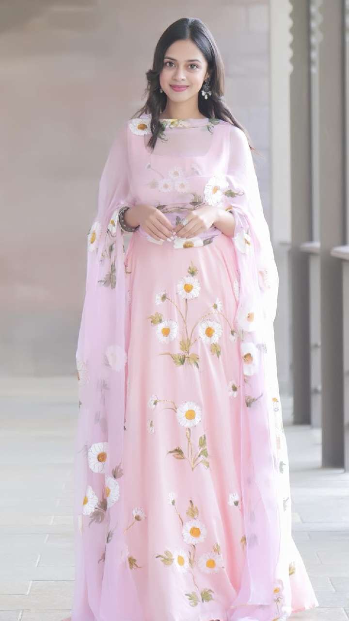 अभिनेत्री पिंक कलर के ए लाइन सूट में ब्यूटीफुल लग रही हैं। सूट के यॉक पर थ्रेड वर्क किया हुआ है। जो काफी खूबसूरत लग रहा है।