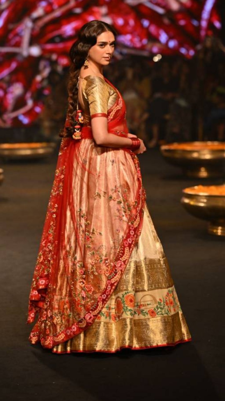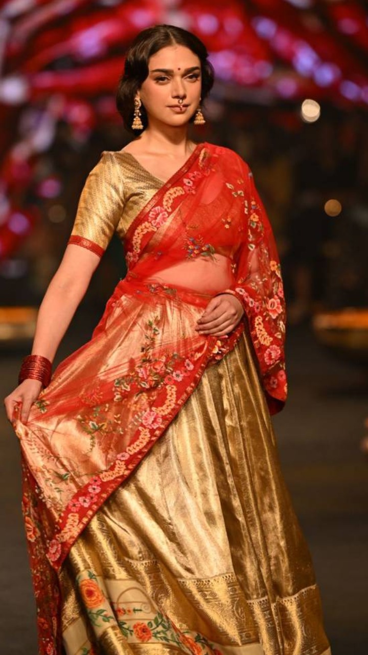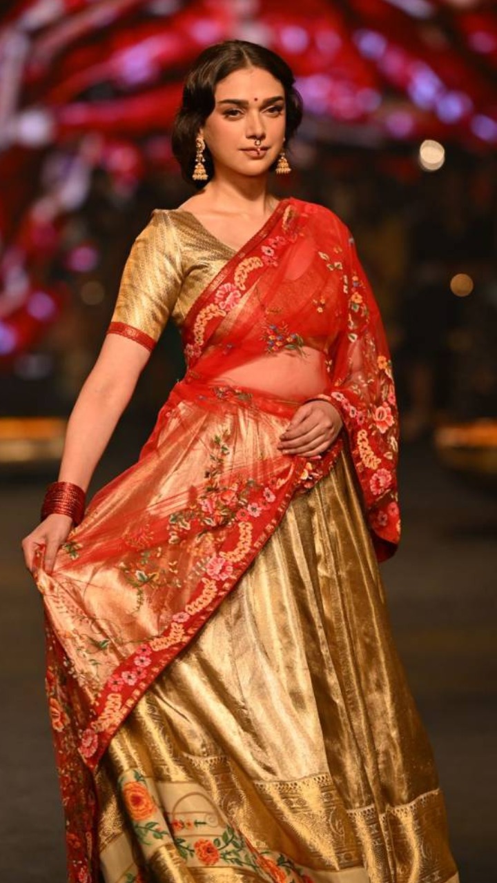 अदिति ने इस मौके पर गोल्डन लहंगे संग रेड चुनरी में रैंप वॉक करती नजर आई।