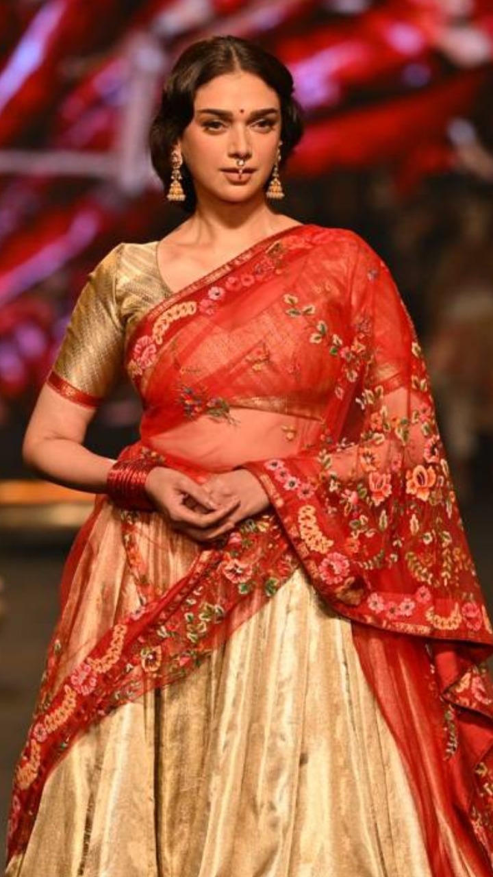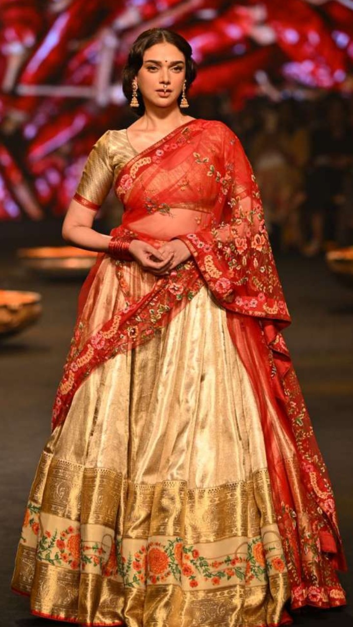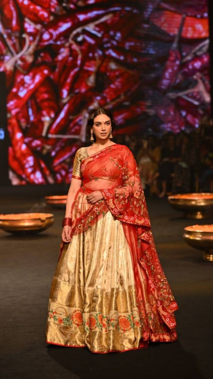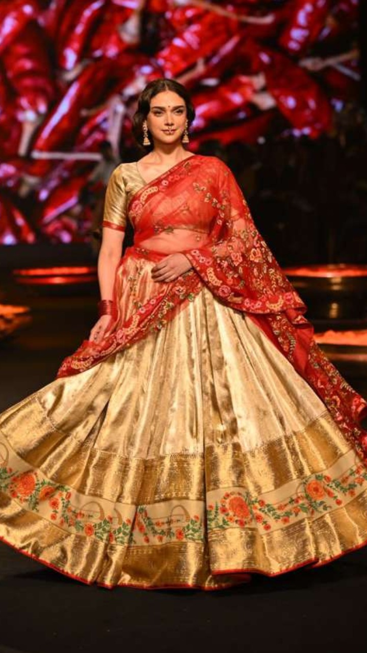 अदिति ने इस मौके पर गोल्डन लहंगे संग रेड चुनरी में रैंप वॉक करती नजर आई।