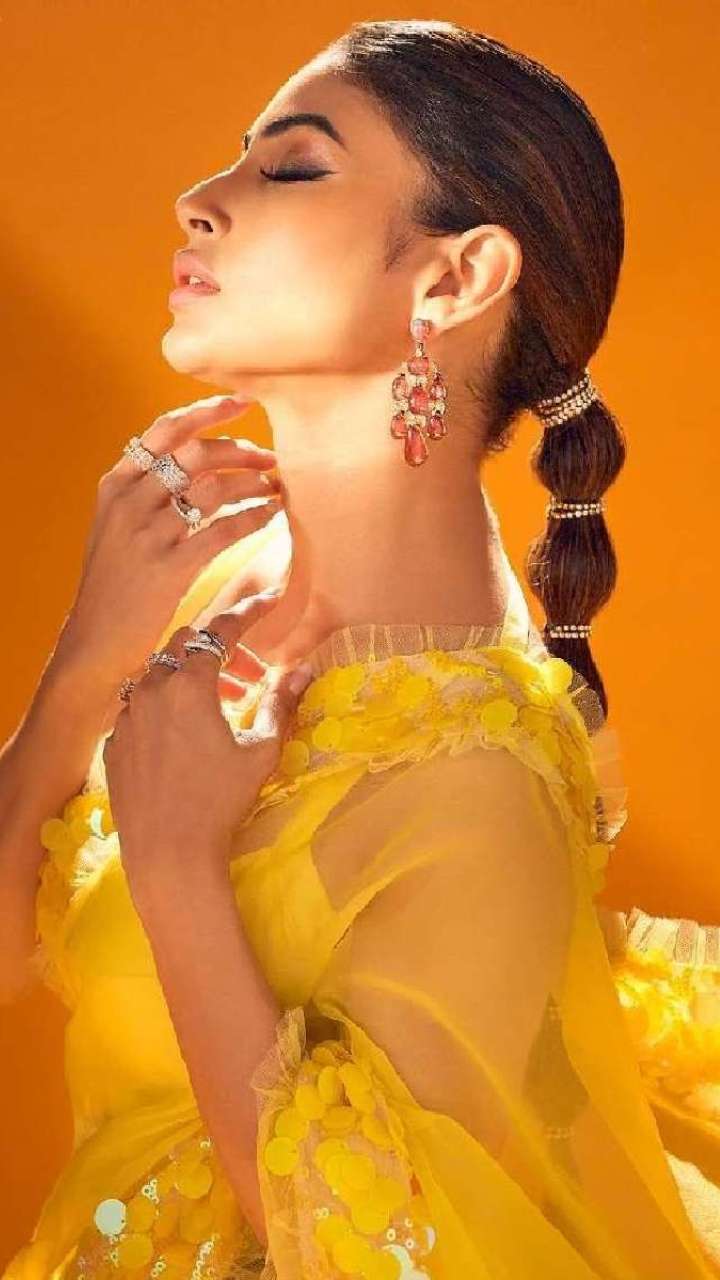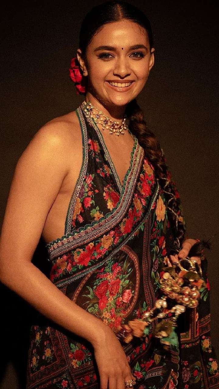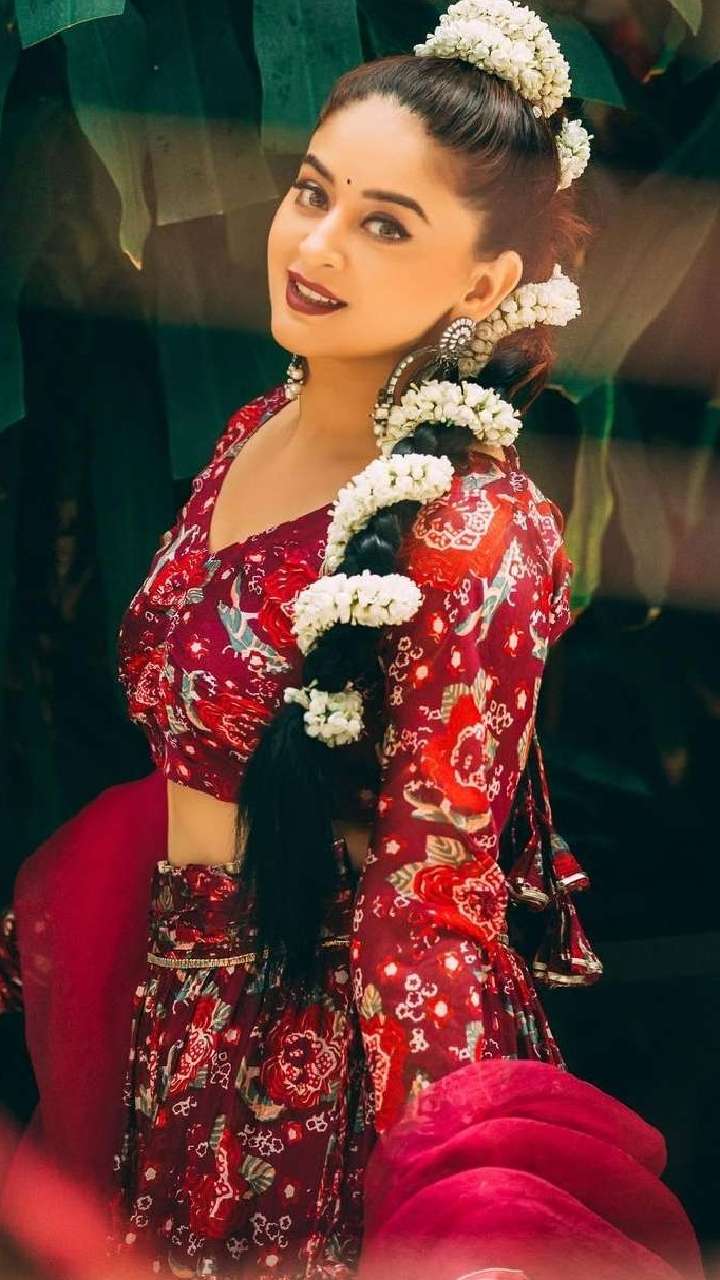 एक्ट्रेस ने हल्टर नेक ब्लाउज के साथ टाइट ट्विस्टेड ब्रेड हेयर स्टाइल को कैरी है। यह देखने में बेहद खूबसूरत लग रहा है।