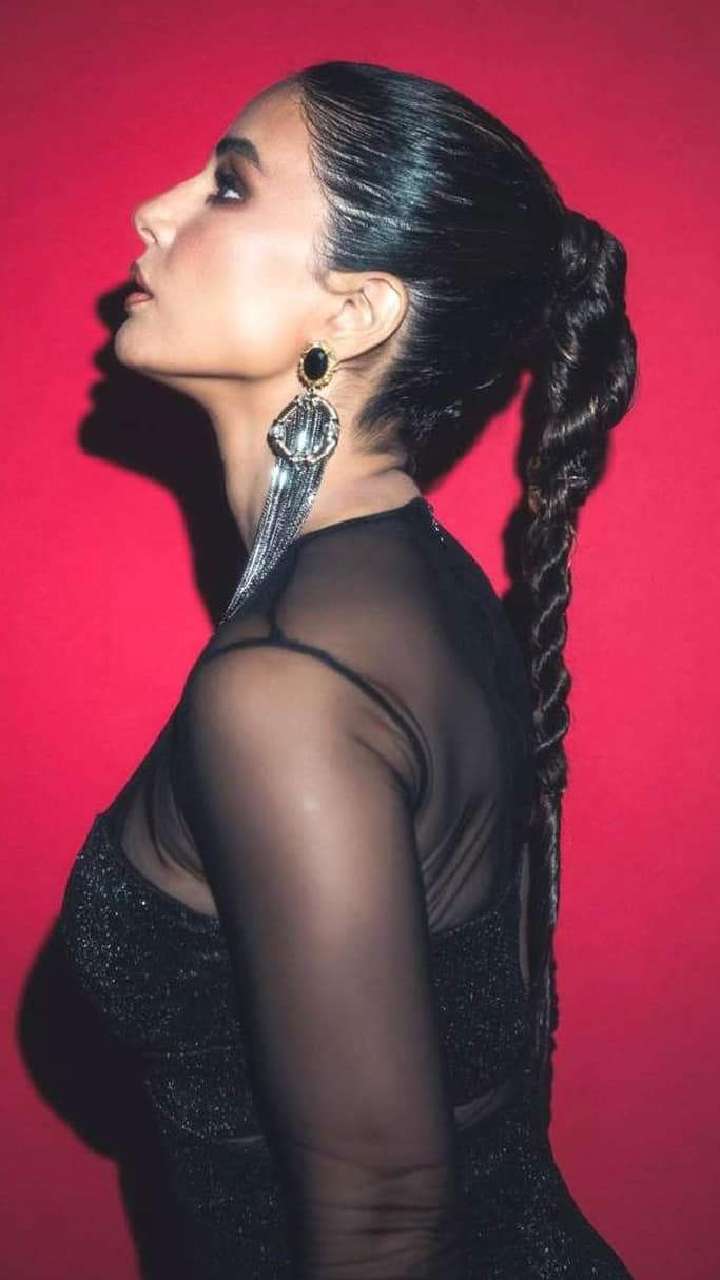 एक्ट्रेस ने ब्लैक ड्रेस और डार्क मेकअप के लुक को अट्रैक्टिव और बॉसी दिखाने के लिए हाई ब्रेड हेयर स्टाइल को कैरी किया है। लेकिन, आप पर्सनैलिटी को क्लासी और लुक को हॉट बनाने के लिए ट्राई करें।