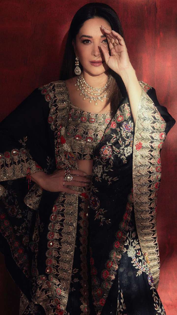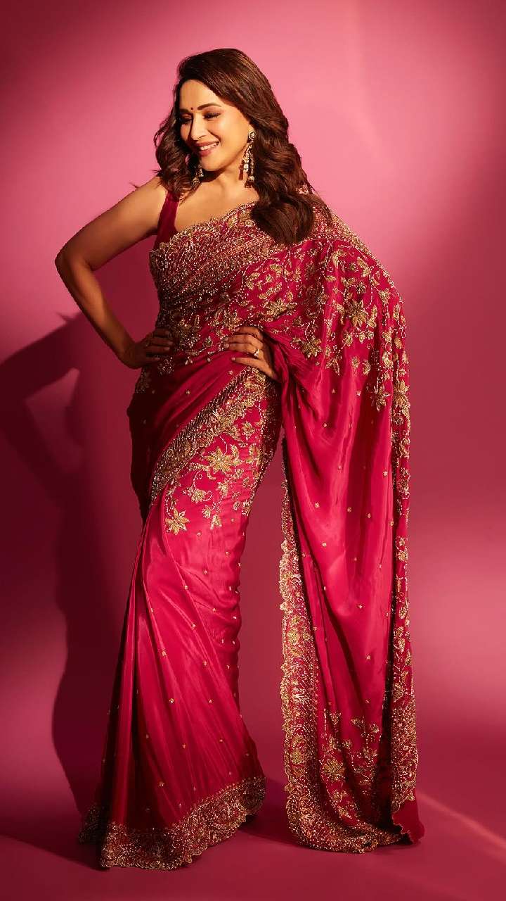 माधुरी दीक्षित के पास साड़ी का शानदार कलेक्शन है। आप एक्ट्रेस की इस ब्लैक साड़ी को रिसेप्शन पार्टी में कैरी कर सकती हैं।