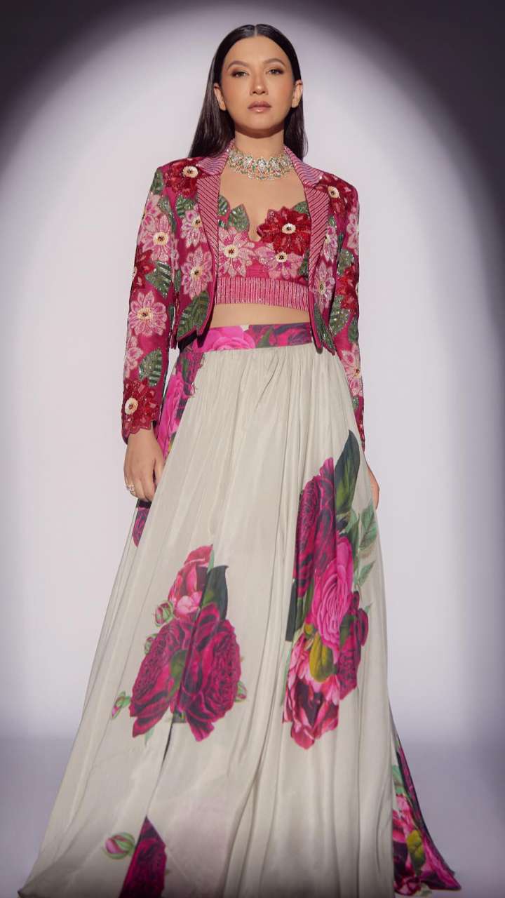 ब्लू कलर के शिमरी इंडो-वेस्टर्न लुक आउटफिट में एक्ट्रेस का लुक बहुत खास है। ये लुक पार्टी के लिए परफेक्ट है।