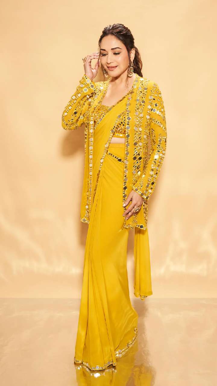 येलो कलर की साड़ी में माधुरी दीक्षित काफी ज्यादा खूबसूरत लग रहीं हैं। साथ ही एक्ट्रेस ने श्रग को पेयर किया है।