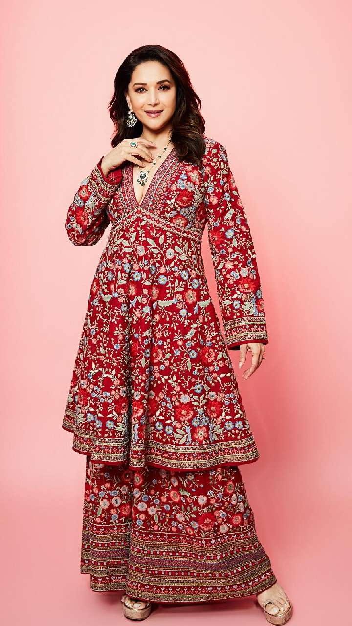 रेड कलर के इस शरारा सूट में माधुरी का लुक काफी अट्रैक्टिव लग रहा है। आप एक्ट्रेस के इस लुक को भी रिक्रिएट कर सकती हैं।