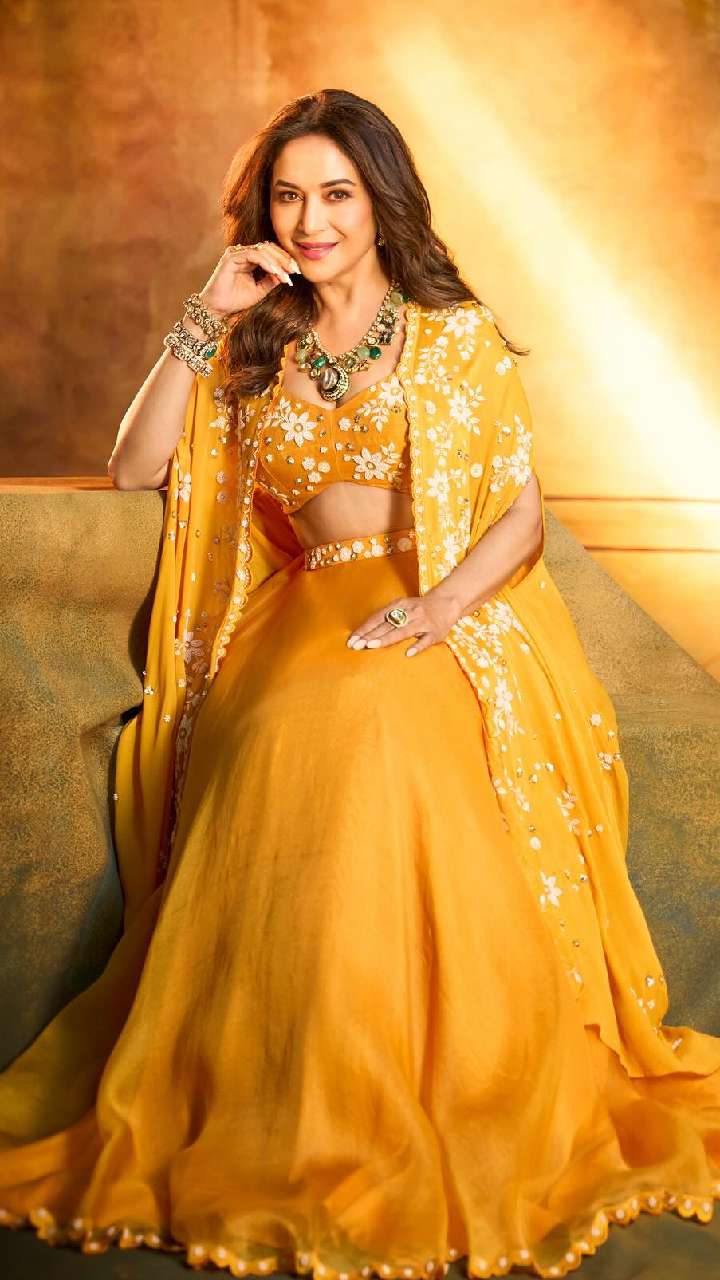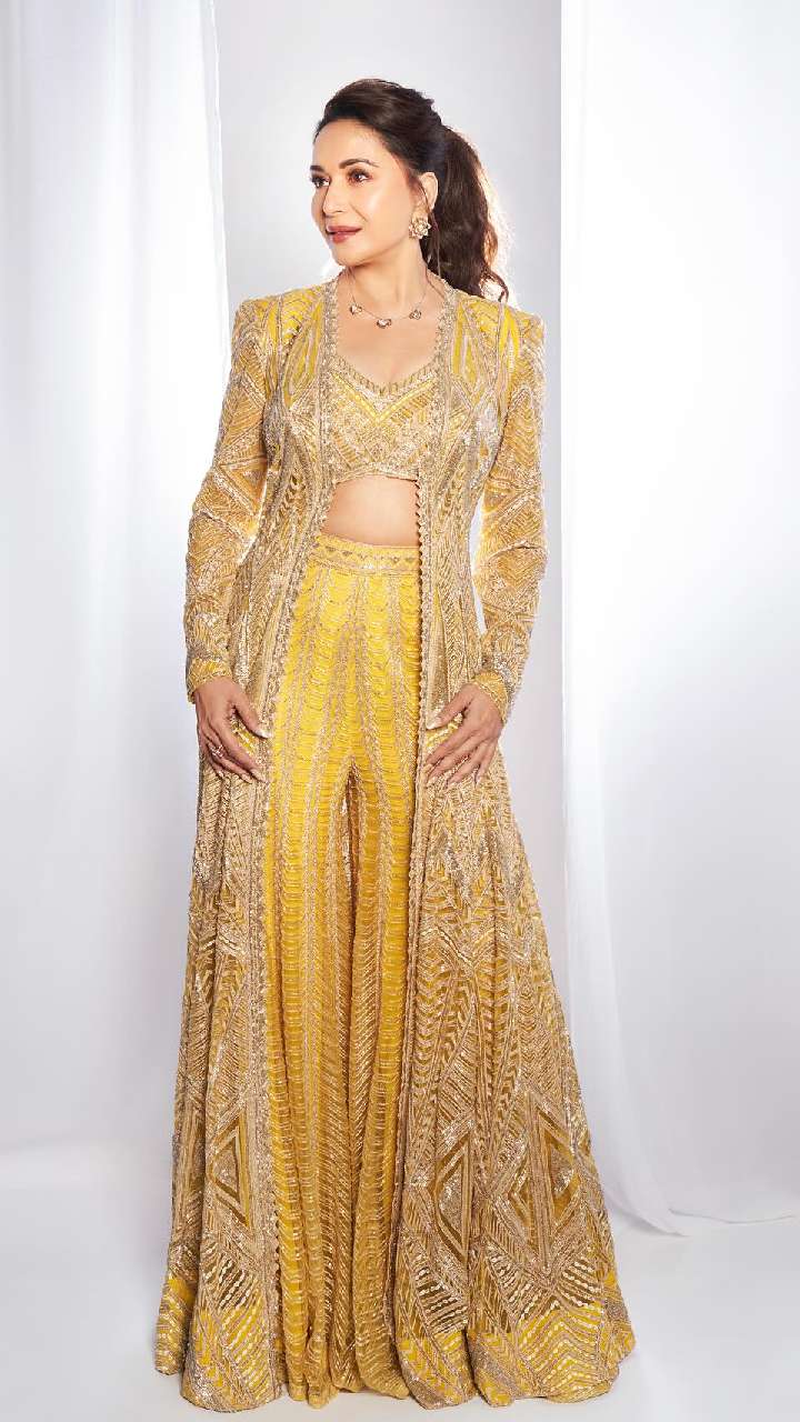 अगर आप शादी में कुछ नया ट्राई करने का सोच रही हैं, तो आप इस तरह के जैकेट घाघरा सेट पहन सकती हैं। इसमें माधुरी दीक्षित ने येलो कलर के ब्लाउज के साथ घाघरा पहना हुआ है। वहीं, लॉग जैकेट ने उनकी खूबसूरती को और बढ़ा दिया है।