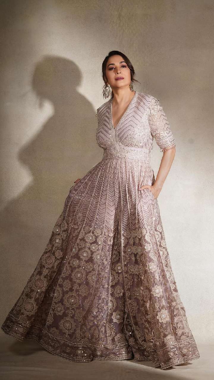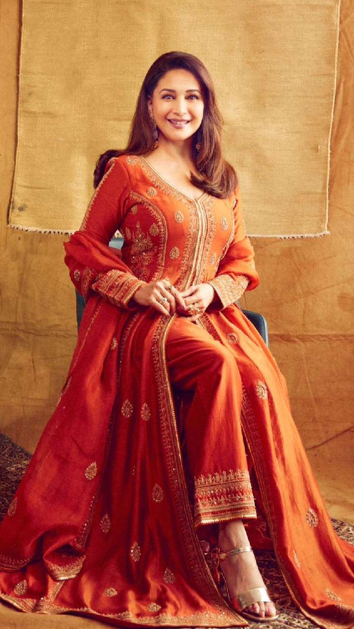इंडियन आउटफिट हो या वेस्टन माधुरी दीक्षित हर ड्रेस में अपनी अदाओं से लोगों का दिल जीत लेती हैं। महिलाएं एक्ट्रेस के इस स्टाइलिश आउटफिट को स्टाइल कर सकती हैं। इसमें उन्होंने ऑरेंज कलर का लॉन्ग सूट वीयर किया हुआ है, जिसमें वो शानदार लग रही हैं।