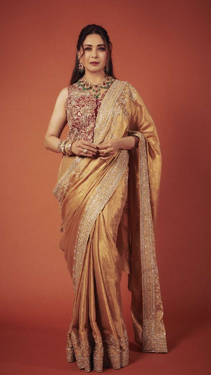 हर महिलाओं की पहली पसंद साड़ी होती है। अगर आप साड़ी पहनने का सोच रही हैं, तो शादी में पहनने के लिए माधुरी दीक्षित की ये साड़ी एकदम परफेक्ट है। एक्ट्रेस ने इस साड़ी को कोटी स्टाइल वाले ब्लाउज के पहना हुआ है। आप भी ऐसा कुछ ट्राई करके अलग लग सकती हैं।