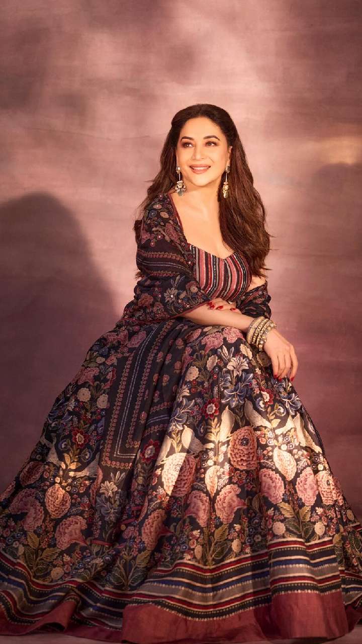 माधुरी दीक्षित की तरह स्टाइलिश दिखने के लिए आप उनके लहंगा लुक को रीक्रिएट कर सकती हैं। इस फोटो में उन्होंने फ्लोरल प्रिंट वाले लहंगा को स्ट्राइप्स वाले ब्लाउज के साथ कैरी किया हुआ है। वहीं, सेम डिजाइन के दुपट्टे ने उनकी खूबसूरती में चार चांद लगा दिया।