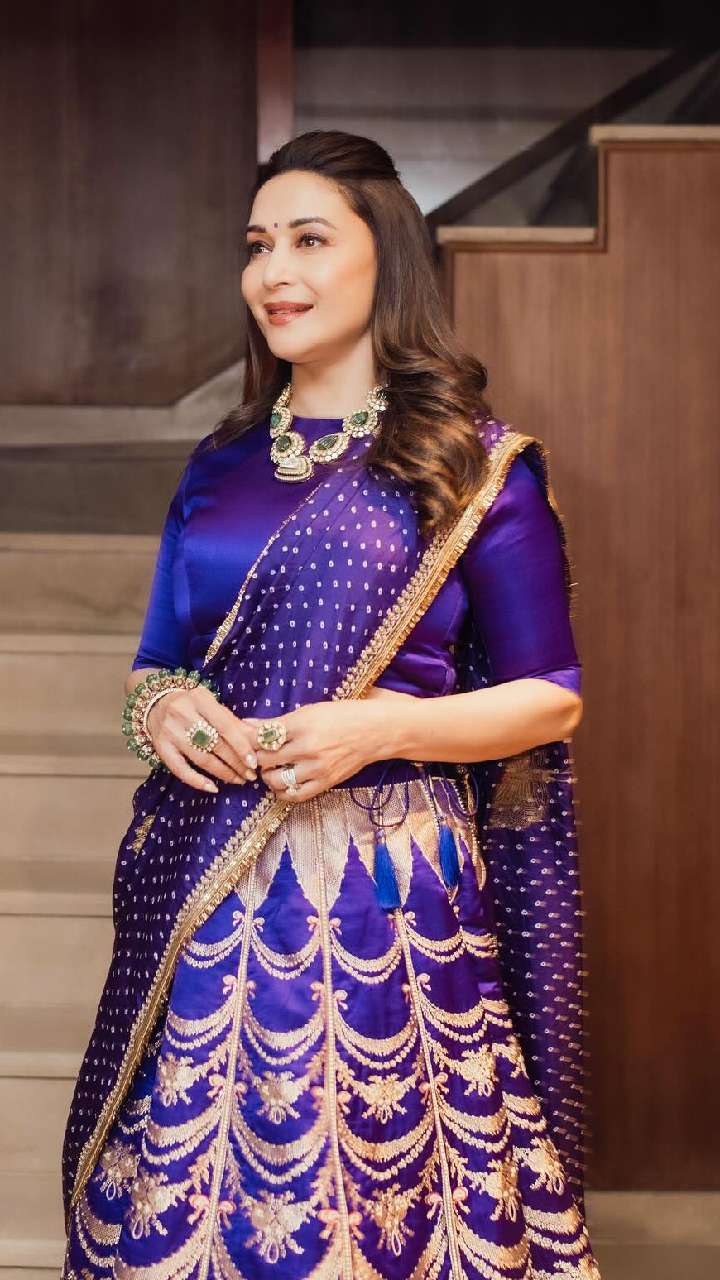 अगर आप साड़ी पहनने के शौकीन हैं, तो माधुरी दीक्षित की तरह स्टाइलिश साड़ी को वियर कर सकती हैं। इस तस्वीर में उन्होंने लेमन ग्रीन कलर की फ्लोरल वर्क साड़ी को स्टाइल किया है, इसमें वह अप्सरा जैसी लग रही हैं।
