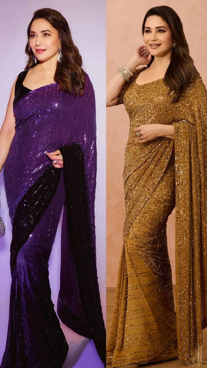 आप माधुरी की इस लाइट ब्लू सेक्विन साड़ी हाल्टर नेक ब्लाउज को भी ट्राई कर सकती हैं। ये आपके लुक को काफी किलर लुक देगा।