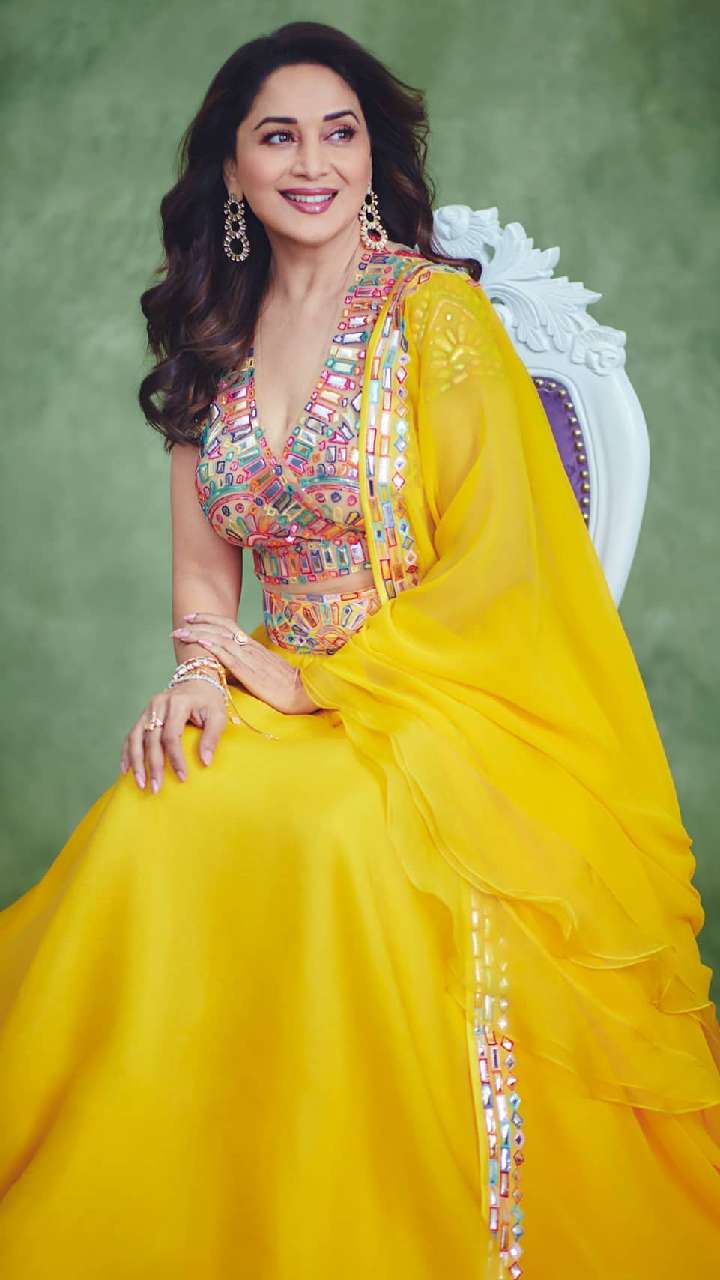 माधुरी का मस्टर्ड कलर साड़ी विद मिरर वर्क बॉर्डर के साथ नूडल स्ट्रैप ब्लाउज लुक एकदम यूनिक है।