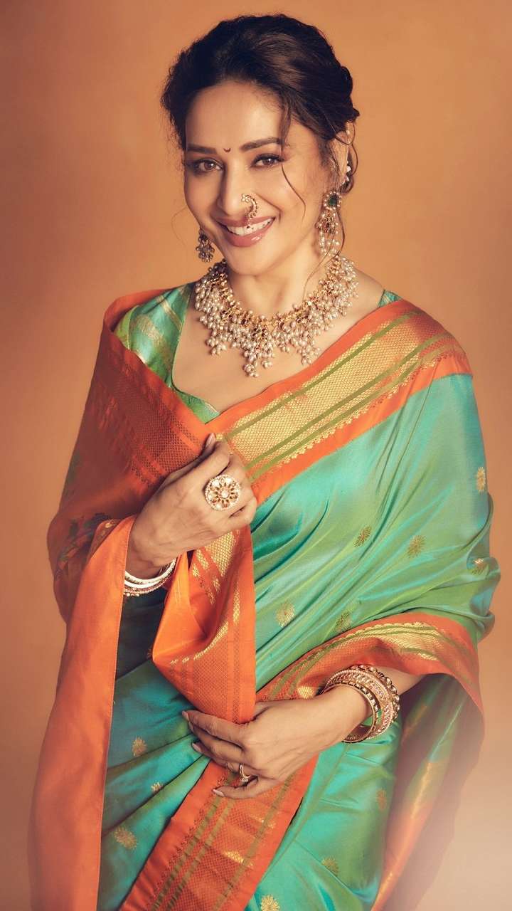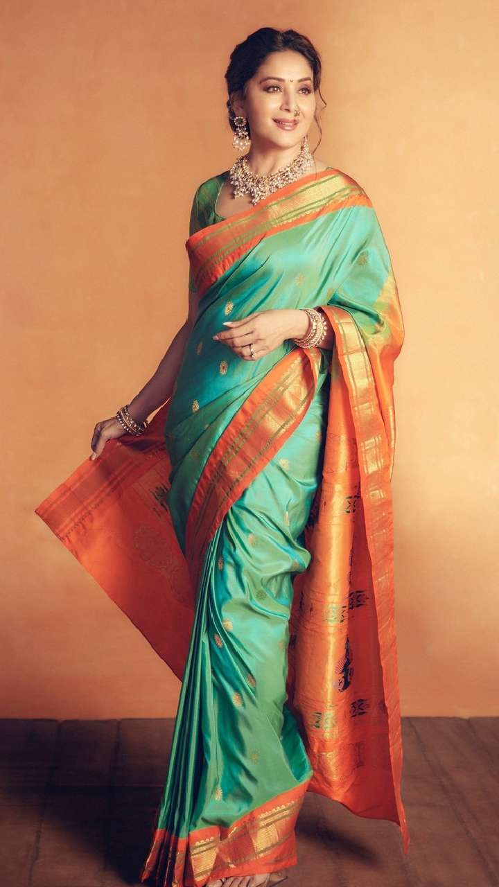 माधुरी दीक्षित का ग्रीन सिल्क साड़ी विद ऑरेंज जारी वर्क बॉर्डर में मराठी मुलगी लुक गणेश चतुर्थी के लिए बेस्ट है।