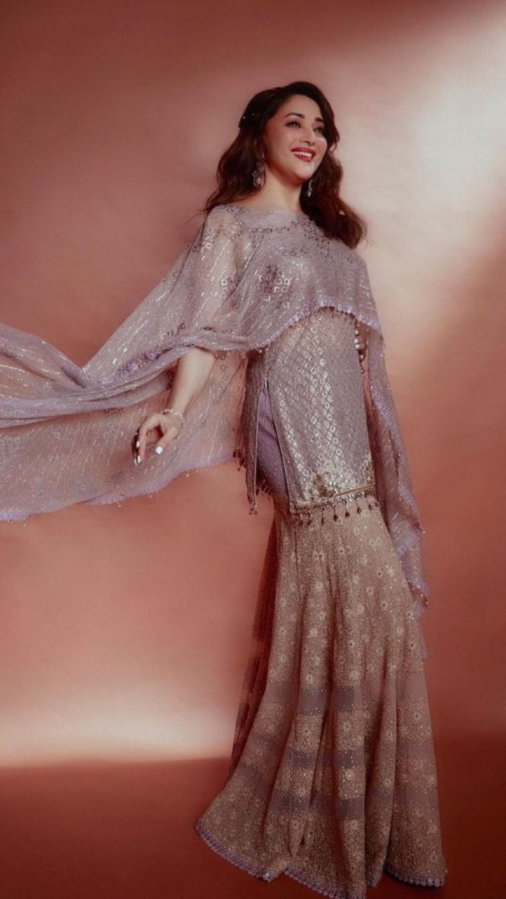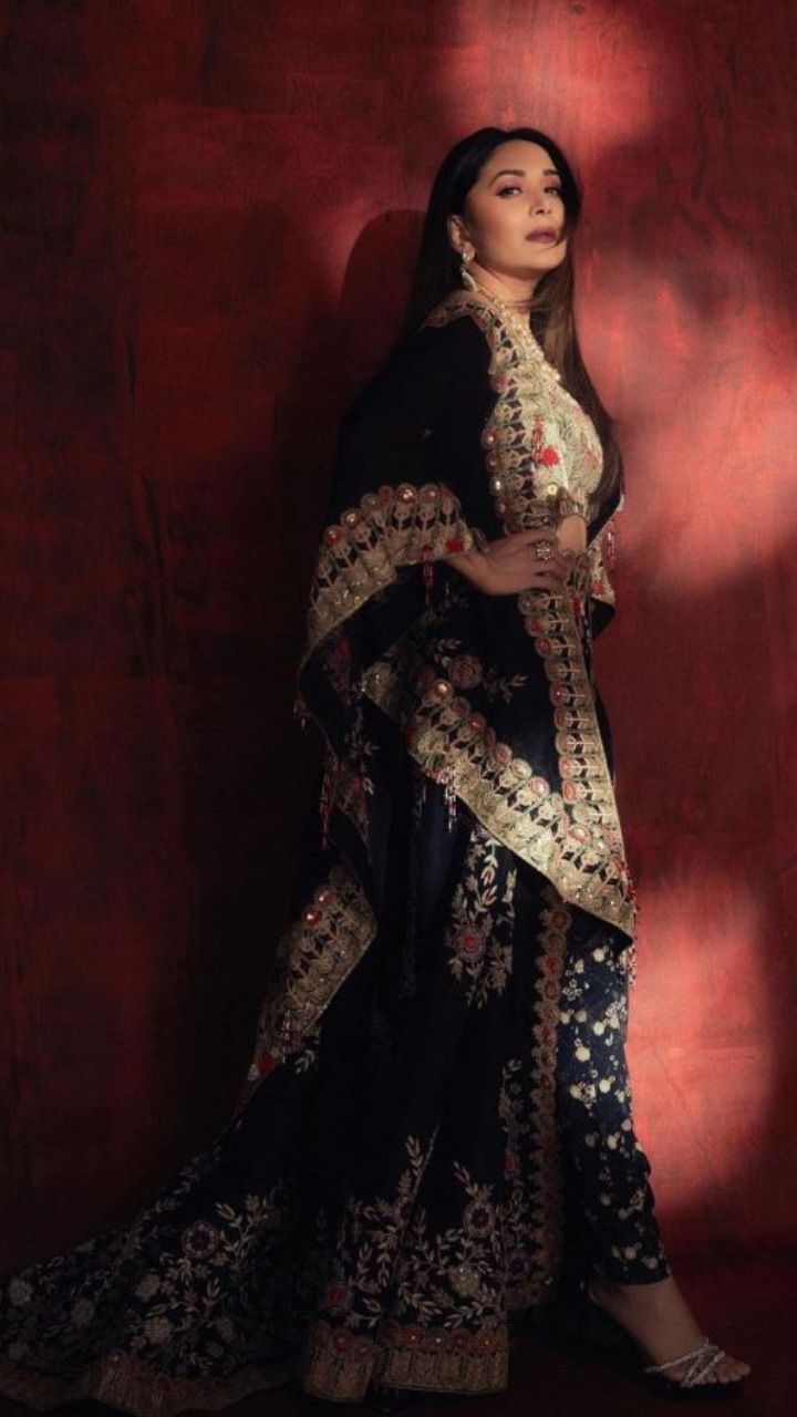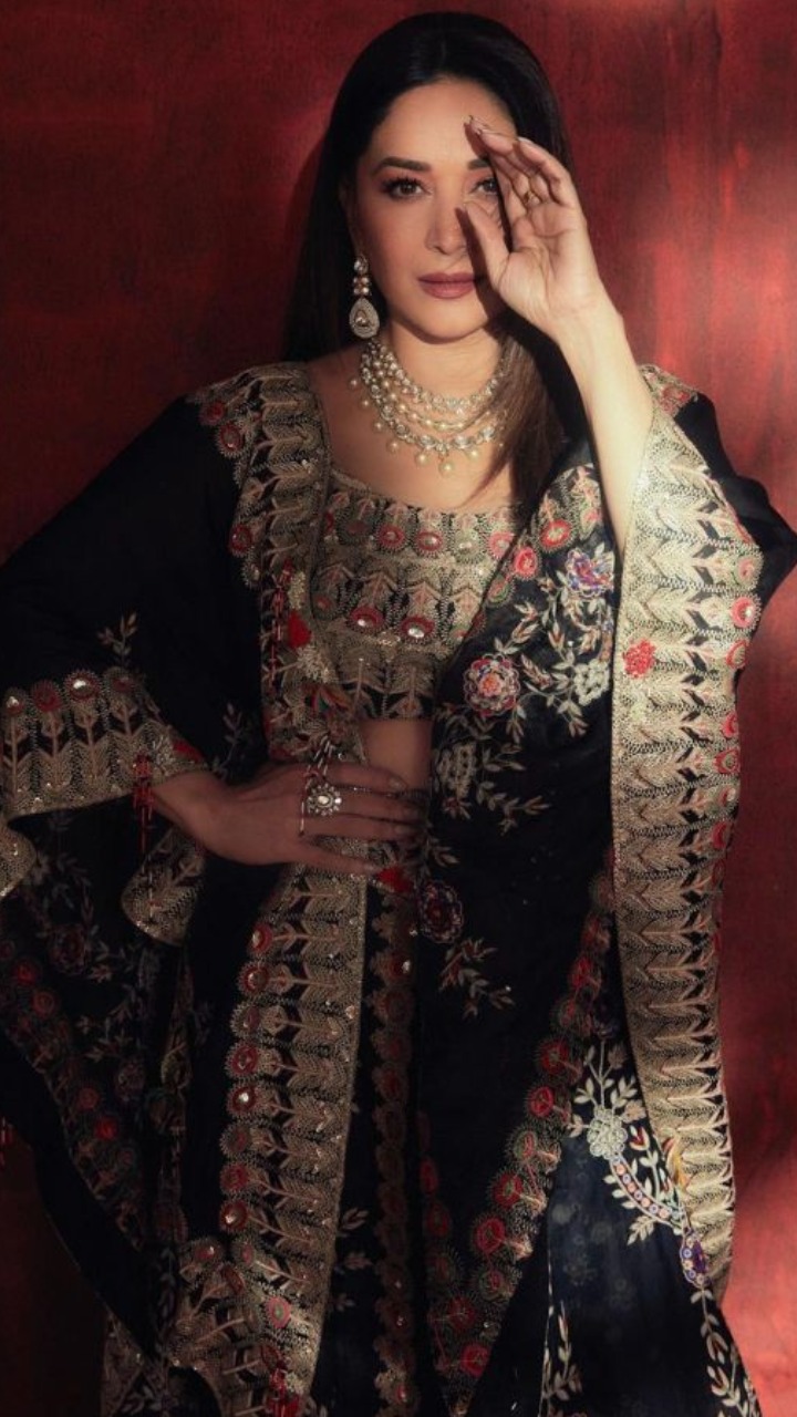 माधुरी दीक्षित का यह इंडो वेस्टर्न लुक काफी अट्रैक्टिव हैं। ब्लैक कलर के आउटफिट के साथ एक्ट्रेस ने गोल्डन लुक भी एड किया है।
