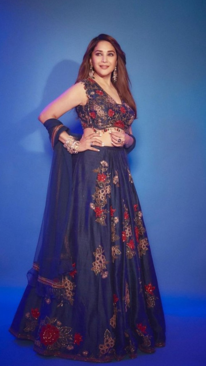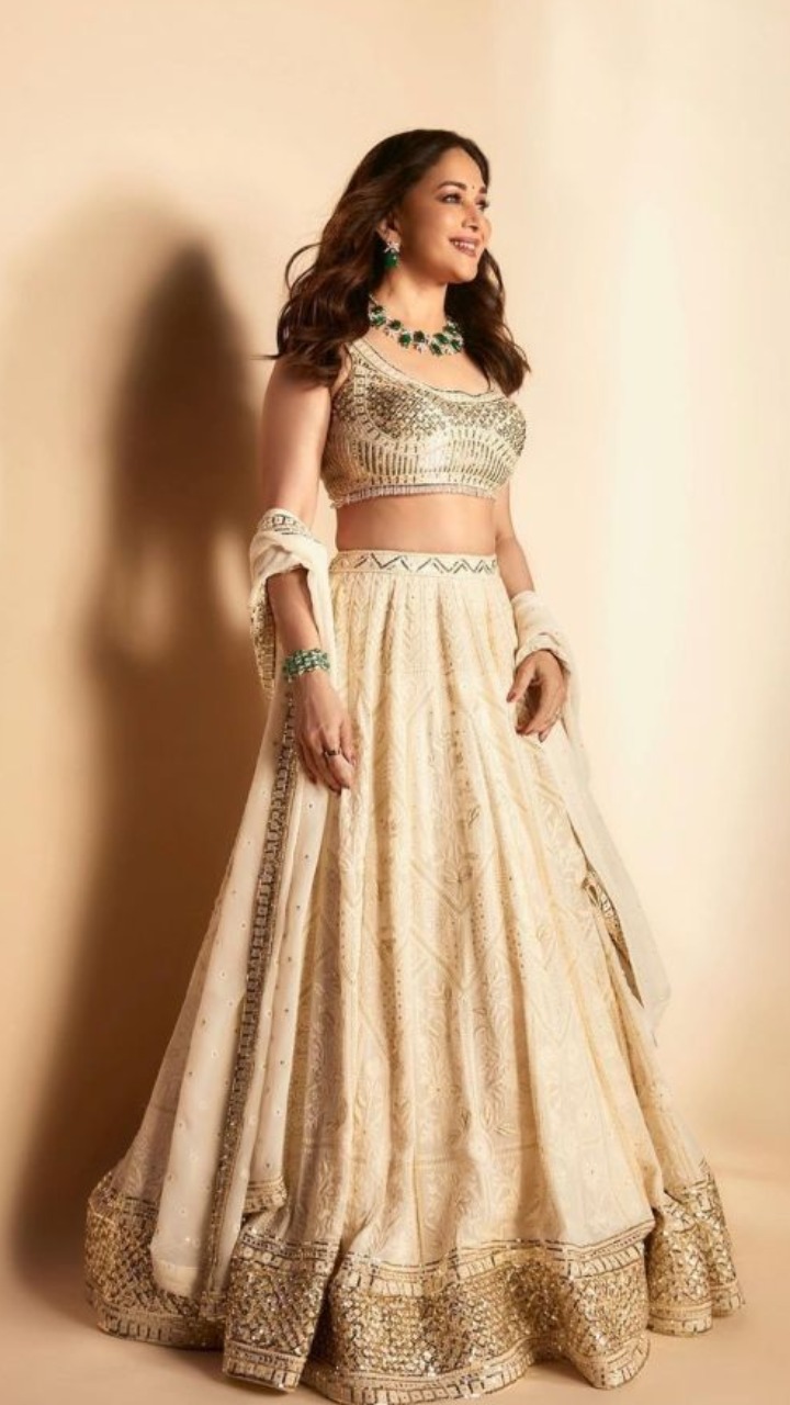 ऑफ व्हाइट लहंगे लुक के साथ माधुरी ने लाइट मेकअप किया है और कंट्रास्ट ज्वेलरी कैरी की है।