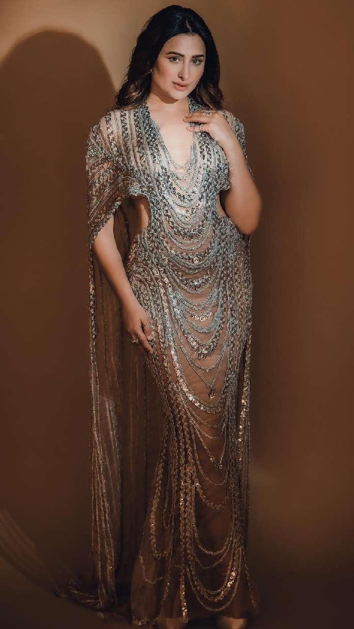 माहिरा बैकलेस ट्रांसपेरेंट सीक्वेन गाउन में गजब ढा रही हैं। अगर आप पार्टनर के साथ पार्टी में हैवी और डिफरेंट लुक चाहती हैं, तो इस तरह के आउटफिट को चुन सकती हैं।