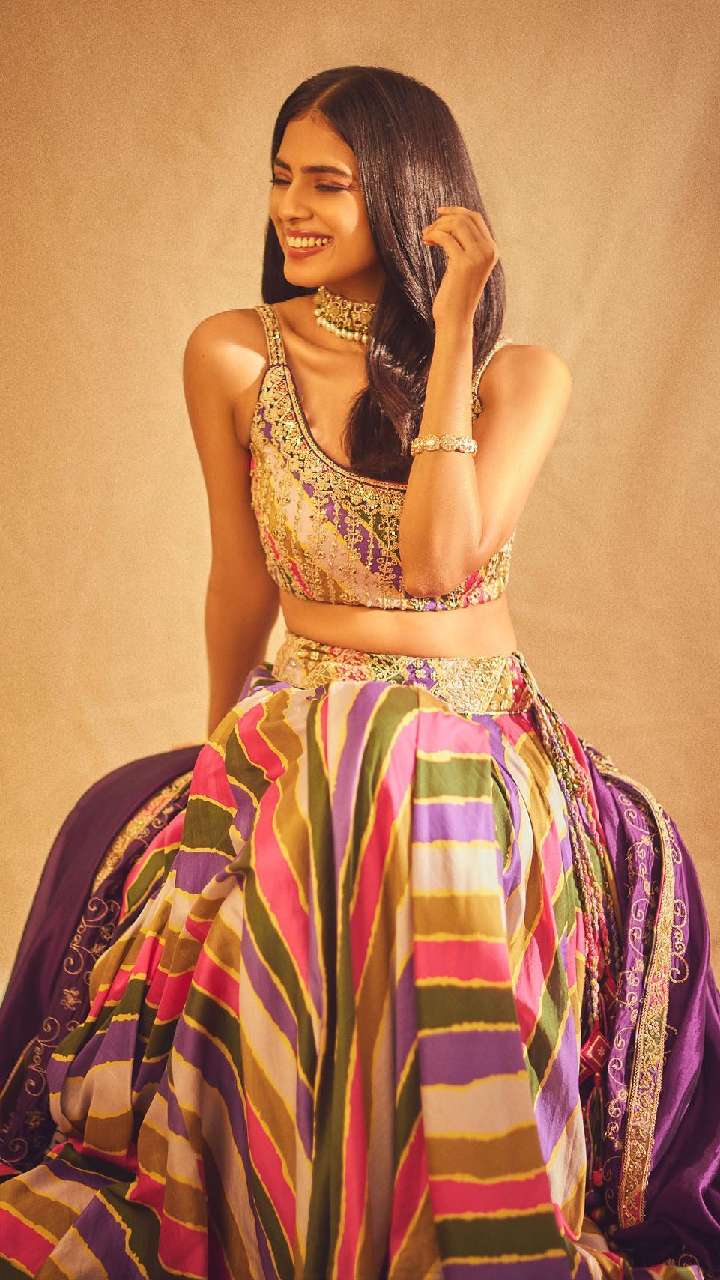 मल्टी कलर लहंगे में भी मालविका का लुक काफी ज्यादा शानदार लग रहा है। मल्टी कलर लहंगा आप संगीत में कैरी करें।