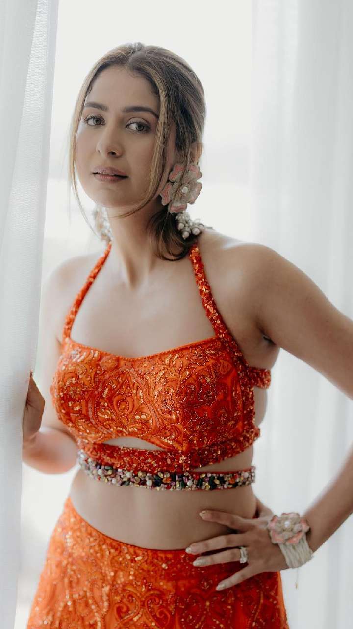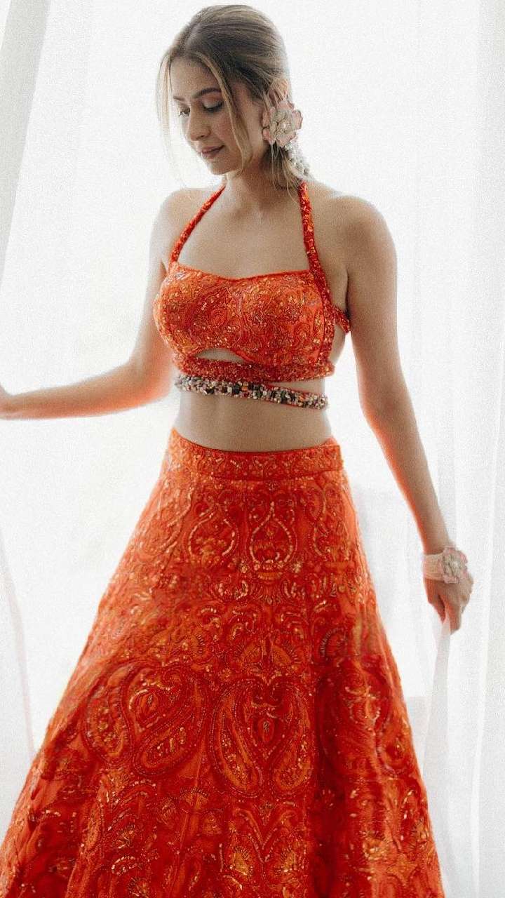 हाल में एक्ट्रेस ने ऑरेंज कलर के सेक्विन लहंगे के साथ हाल्टर नेक चोली में अपना बेहद गॉर्जियस लुक शेयर किया है।
