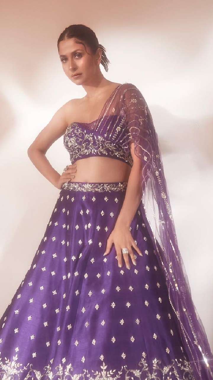 मालविका ने पर्पल लहंगे के साथ काफी डिजाइनर वन शोल्डर चोली से खुद को बोल्ड लुक दिया है।