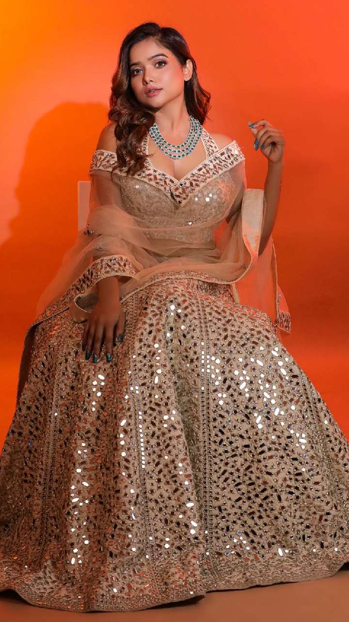 मनीषा क्रीम कलर के हैवी मिरर वर्क लहंगे हाल्टर नेक चोली में बला की खूबसूरत लग रही हैं। उन्होंने दुपट्टे को स्टाइलिश तरीके से कैरी किया है।