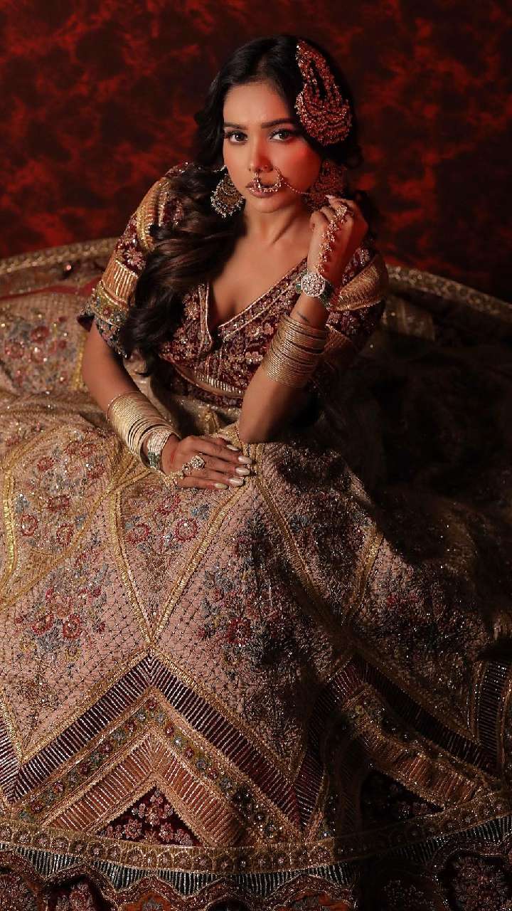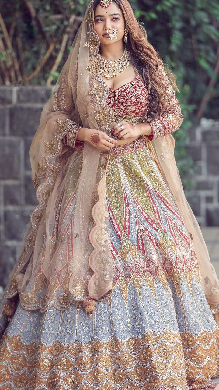 वेडिंग में ब्राइडल डीवा के फुल हैवी वर्क सेक्विन लहंगे से आइडिया ले सकती हैं। इसके साथ उन्होंने कुंदन ज्वैलरी डीप नेक ब्लाउज से अपना लुक कंप्लीट किया है।
